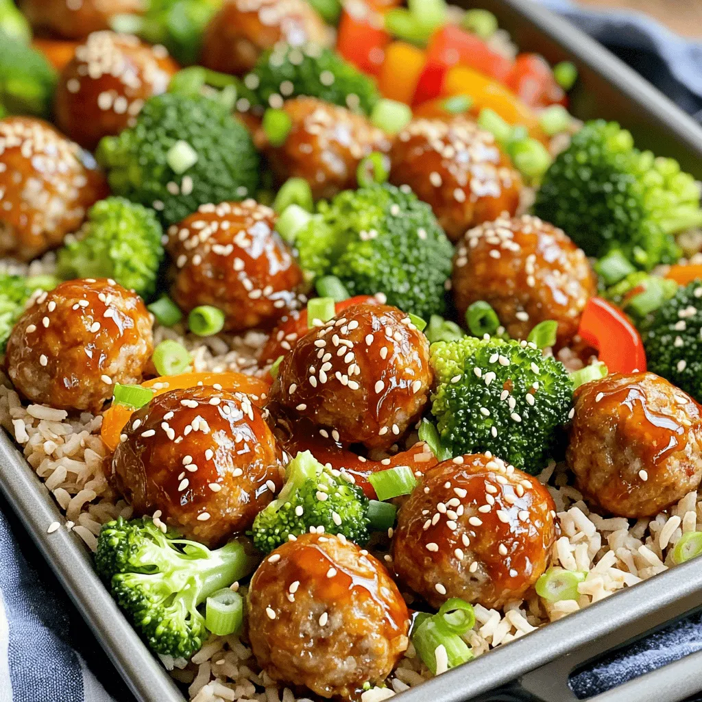 I like to use broccoli florets and red bell pepper. They add color and crunch. The olive oil helps the veggies roast perfectly. Serving the meatballs over cooked brown rice makes the dish hearty. Garnishing with sesame seeds and green onions adds a lovely touch.