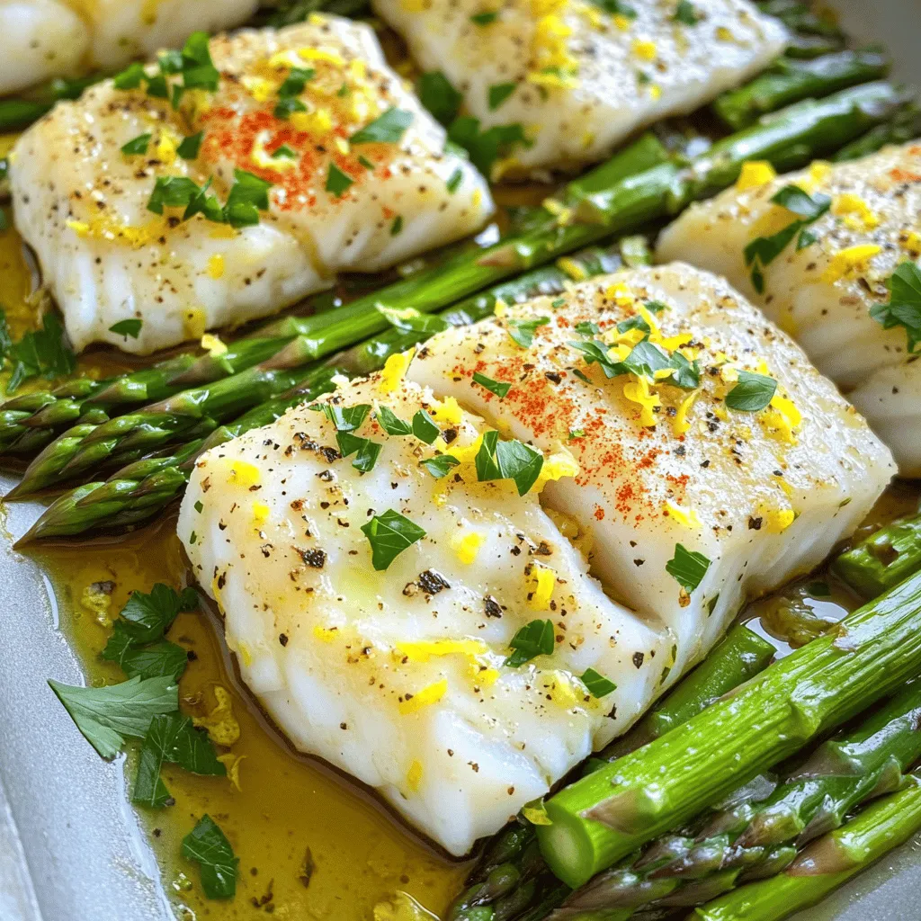 - 4 cod fillets (about 6 oz each) - 1 bunch asparagus, trimmed - 3 tablespoons olive oil, divided - 4 cloves garlic, minced - 1 lemon, zested and juiced - 1 teaspoon paprika - Salt and pepper to taste - Fresh parsley, chopped (for garnish) This recipe uses fresh cod fillets. They should be about six ounces each. The cod has a mild flavor and works well with lemon and garlic. Asparagus adds a bright green color and a crisp texture. You will need one bunch of asparagus for this dish. Olive oil keeps everything moist and adds a nice flavor. You will use three tablespoons, split between the cod and asparagus. Now, let’s add some zing with our seasonings. Garlic is essential here. You will need four cloves, minced. This gives a strong flavor that mixes well with the fish. The zest and juice of one lemon will brighten the dish. It adds a fresh taste that pairs perfectly with the cod. Paprika adds warmth and a hint of smoke. Just one teaspoon is enough to enhance the dish without overpowering it. Don’t forget to season with salt and pepper. These simple ingredients boost the overall taste. Fresh parsley adds a lovely touch as a garnish. It makes your dish look appealing and adds a bit of freshness. First, preheat your oven to 425°F (220°C). This high heat helps cook the cod and asparagus quickly. It also helps to lock in flavors. Next, line a large sheet pan with parchment paper. This paper keeps the food from sticking. It makes clean-up much easier too! Now, let’s season the cod. In a small bowl, mix 2 tablespoons of olive oil, minced garlic, lemon zest, lemon juice, paprika, salt, and pepper. This mixture adds great taste to the fish. Use a brush to coat both sides of the cod fillets. Make sure the cod is well covered for the best flavor. Take your bunch of asparagus and trim the ends. Hold the asparagus at both ends and bend it gently. It will snap where it needs to be cut. This keeps the best part of the stalk. Place the trimmed asparagus in a bowl. Drizzle the last tablespoon of olive oil over it. Add salt and pepper, then toss the asparagus to coat it evenly. Now, it’s time to arrange everything on the pan. Place the cod fillets in the center of the sheet pan. Spread the seasoned asparagus around the cod in a single layer. This helps everything cook evenly. Then, put the pan in the oven. Bake for about 15-20 minutes. The cod is done when it flakes easily with a fork and the asparagus is tender. To make sure your cod is top-notch, choose fillets that are bright and have no fishy smell. Fresh cod should look moist and have a firm texture. Keep your eyes on the thickness of the fillets, as they should be about 1 inch thick. This helps them cook evenly. To avoid dryness, do not overcook the cod. Bake it for 15 to 20 minutes at 425°F. Check for doneness by lightly pressing it with a fork. If it flakes easily, it's ready! A little bit of lemon juice helps keep the fish moist, so don’t skip that step. Adding herbs can make your asparagus shine. Try fresh dill or thyme for a different flavor. You can also sprinkle some grated Parmesan cheese on top before baking for a cheesy twist. For crunchiness, do not overcrowd the asparagus on the sheet pan. Give each piece space to roast. Bake it alongside the cod for just the right amount of time. If you like your asparagus extra crunchy, take it out a few minutes before the fish. Garnishing makes a meal look special. Use chopped fresh parsley for color and freshness. You can also add thin lemon slices on top for extra zing. For serving, place the cod in the center of the plate, with asparagus arranged around it. This not only looks great but also adds texture to each bite. Serve with a wedge of lemon for an extra burst of flavor. {{image_2}} If you want to switch up the cod, try using salmon or tilapia. Salmon has a rich flavor and cooks well. Tilapia is mild and great for quick meals. When using salmon, reduce the cooking time by 2-3 minutes. Salmon cooks faster. If using tilapia, keep the cooking time similar to cod. This fish also flakes nicely when done. Asparagus shines in this dish, but many other veggies work too. You can use broccoli, green beans, or zucchini. Each adds its own taste and texture. When swapping veggies, keep cooking times in mind. Broccoli takes about the same time as asparagus. Green beans may need a minute or two longer. Zucchini cooks quickly, so add it halfway through. Changing the seasonings can give this dish a new twist. Consider adding dill or thyme for a fresh taste. These herbs blend well with lemon and garlic. If you like heat, add a pinch of red pepper flakes. This spice can boost the flavor without overpowering it. Enjoy experimenting with different seasonings to find your perfect mix! Store your leftovers in airtight containers. Glass or plastic containers work well. Make sure to cool the cod and asparagus to room temperature first. This helps prevent condensation. Place them in the fridge within two hours of cooking. Eat the leftovers within three days for the best taste. The best way to reheat cod and asparagus is in the oven. Preheat your oven to 350°F (175°C). Place the dish in the oven for about 10 minutes. This keeps everything warm without making it soggy. You can also use a microwave, but be careful. Heat in short bursts to avoid rubbery fish. To freeze cod and asparagus, let them cool completely. Wrap each piece in plastic wrap. Place them in a freezer-safe bag. Remove as much air as possible to prevent freezer burn. You can freeze them for up to three months. When you’re ready to eat, thaw them in the fridge overnight. Reheat them in the oven or on the stove. This way, they stay tasty and fresh! You can pair this dish with many sides. Here are some ideas: - Rice: A fluffy white or brown rice works well. - Quinoa: This adds a nutty flavor and is rich in protein. - Salads: A light green salad with lemon vinaigrette complements the dish. - Potatoes: Roasted or mashed potatoes can add heartiness