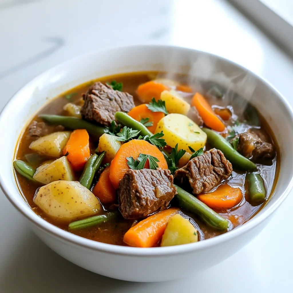 - 2 lbs beef chuck, cut into 1-inch cubes - 4 medium carrots, sliced - 3 potatoes, diced - 2 stalks celery, chopped - 1 large onion, chopped - 3 cloves garlic, minced - 4 cups beef broth - 1 can (14 oz) diced tomatoes, undrained - 1 cup green beans, trimmed and cut into 1-inch pieces - 2 teaspoons dried thyme - 1 teaspoon smoked paprika - 1 teaspoon salt - ½ teaspoon black pepper - 2 tablespoons olive oil - 1 tablespoon Worcestershire sauce - 1 bay leaf You can swap beef chuck for stew meat or brisket if needed. If you want a lighter stew, use chicken instead. For a vegetarian option, use mushrooms or lentils. Instead of carrots, try parsnips for a sweet twist. You can replace beef broth with vegetable broth for a lighter flavor. If you don’t have fresh herbs, dried herbs work too, just use less. When buying beef, look for bright red color and little fat. Choose firm and smooth potatoes. For carrots, pick ones that feel heavy and have a rich color. Celery should be crisp and green, while onions must be firm and dry. Choose garlic that is plump and free of spots. Fresh green beans should snap easily. Always check the expiry date on canned goods for freshness. Start with 2 lbs of beef chuck. Cut it into 1-inch cubes. This size helps the beef cook evenly. Heat 2 tablespoons of olive oil in a skillet over medium-high heat. Season the beef with 1 teaspoon of salt and ½ teaspoon of black pepper. Sear the beef cubes in batches until they are brown on all sides. This step adds great flavor. Use a slotted spoon to transfer the beef to your slow cooker. Now, it's time to layer the veggies. Add the seared beef to the slow cooker. Next, slice and add 4 medium carrots, dice 3 potatoes, and chop 2 stalks of celery. Then, chop 1 large onion and mince 3 cloves of garlic. Stir all these ingredients together in the slow cooker. Next, pour in 4 cups of beef broth and 1 can of diced tomatoes (14 oz), undrained. Ensure all the ingredients are covered. Add 1 tablespoon of Worcestershire sauce, 2 teaspoons of dried thyme, 1 teaspoon of smoked paprika, and 1 bay leaf. These spices enhance the stew's flavor. Cover your slow cooker and set it to cook. You can choose to cook on low for 8 hours or on high for 4 hours. The beef needs to be tender when done. In the last hour of cooking, add 1 cup of trimmed and cut green beans. This keeps them crisp and fresh. Once finished, taste the stew and adjust the seasoning with more salt or pepper as needed. Don’t forget to remove the bay leaf before serving. Enjoy your hearty stew! Searing beef is key for great flavor. Start with a hot skillet. Use medium-high heat and add olive oil. Make sure to season the beef with salt and pepper before you cook it. This step helps seal in the juices. Cook the beef in small batches, so it browns well. Don’t overcrowd the pan. Each piece needs space to sear properly. You want that nice brown crust on all sides. This will give your stew a rich taste. To make the stew even tastier, consider these tips. First, use fresh herbs if you can. They add a lively flavor. Next, add a splash of red wine before cooking. This gives depth to the dish. You can also try adding a tablespoon of tomato paste. This thickens the stew and boosts the tomato flavor. Finally, adjust the seasoning at the end of cooking. Taste the stew and add more salt or pepper if needed. This ensures every bite is delicious. If your stew is too thin, don’t worry. There are easy ways to thicken it. One method is to mix a tablespoon of cornstarch with cold water. Stir this mixture into the stew and let it cook for 15 more minutes. Another option is to mash some of the potatoes in the stew. This adds creaminess and body. You can also let the stew cook uncovered for the last hour. This helps some of the liquid evaporate, making it thicker. {{image_2}} You can make a tasty vegetarian stew by swapping out beef for hearty veggies. Use mushrooms for a meaty texture. Add lentils for protein and fiber. Replace beef broth with vegetable broth for a rich taste. Carrots, potatoes, and celery still work well. Toss in some peas for sweetness. This version is filling and healthy. Feel free to get creative with your veggie choices. You can add: - Zucchini, sliced into half-moons - Bell peppers, diced for color - Sweet corn, fresh or frozen - Butternut squash, cubed for sweetness - Spinach or kale, added at the end These veggies not only add flavor but also boost nutrients. Adjust cooking times for softer veggies. Spices can change the stew's whole vibe. Here are some ideas: - Add red pepper flakes for heat. - Stir in fresh herbs like rosemary or parsley. - Use curry powder for a warm twist. - Try a splash of red wine for depth. - Replace smoked paprika with regular paprika for a milder flavor. Experiment and find the mix you love best. Each change can create a new favorite dish! To store your beef vegetable stew, let it cool first. Use an airtight container. You can keep it in the fridge for about 3 to 4 days. Make sure to label the container with the date. This way, you know when to eat it. If you want to freeze the stew, pour it into a freezer-safe container. Leave some space at the top for expansion. The stew will stay good for about 3 months in the freezer. When you're ready to use it, just take it out and let it thaw in the fridge overnight. When reheating, use a pot on the stove over medium heat. Stir the stew often to heat it evenly. You can also use a microwave. Put it in a microwave-safe bowl and cover it with a lid. Heat in short bursts, stirring in between. Add a splash of broth if it seems too thick. You can store Slow Cooker Beef Vegetable Stew in the fridge for up to four days. Make sure to keep it in an airtight container. If you want to keep it longer, freeze it. In the freezer, it stays good for up to three months. Just thaw it in the fridge overnight before reheating. Yes, you can make this stew in an Instant Pot. Start by using the sauté function to sear the beef, just