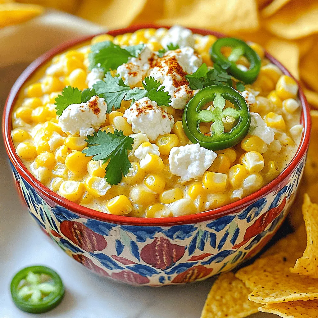 - 4 cups frozen corn, thawed - 1 cup cream cheese, softened - 1 cup sour cream - 1 cup mayonnaise - 1 cup shredded queso fresco or feta cheese - 1 jalapeño, finely chopped (remove seeds for less heat) - 2 cloves garlic, minced - 1 teaspoon chili powder - 1 teaspoon cumin - 1 tablespoon lime juice - 1/2 cup chopped fresh cilantro - Salt and pepper to taste The ingredients are the heart of this dip. They work together to create a creamy, dreamy delight. The corn brings sweetness, while the cheeses add richness and flavor. Cream cheese, sour cream, and mayonnaise create a smooth base. The spices, lime juice, and cilantro add a burst of freshness. - Alternatives for Cream Cheese: You can use Greek yogurt or cottage cheese. These options keep it creamy while adding a tangy flavor. - Dairy-Free Options: Try using cashew cream or a dairy-free sour cream. These will still give a nice texture. - Different Types of Cheese: If you can't find queso fresco, feta works well. Cheddar or pepper jack can also add a unique twist. These substitutions let you customize the dip to fit your needs. Whether you're dairy-free or just want to try something new, you can get creative! 1. Start by gathering your base ingredients. In a big bowl, mix together: - 4 cups frozen corn, thawed - 1 cup cream cheese, softened - 1 cup sour cream - 1 cup mayonnaise 2. Blend these ingredients well. You want a smooth and creamy base. 3. Now, it's time for the flavor boost. Add in: - 1 cup shredded queso fresco or feta cheese - 1 jalapeño, finely chopped (remove seeds for less heat) - 2 cloves garlic, minced - 1 teaspoon chili powder - 1 teaspoon cumin - 1 tablespoon lime juice 4. Stir everything together until mixed evenly. 5. Season to taste with salt and pepper. 1. Pour the mixture into your slow cooker. 2. Cover the slow cooker and set it to low heat. 3. Cook for 2-3 hours. Stir occasionally to ensure even heating. 4. Your dip is ready when it is hot and combined well. 1. Serve the dip warm for the best flavor. 2. Accompany it with: - Tortilla chips - Veggie sticks 3. For a fun touch, serve the dip in a colorful bowl. 4. Garnish with fresh cilantro and crumbled queso fresco. 5. Place it on a vibrant tablecloth to enhance the festive look. To get the right consistency, mix the corn with cream cheese, sour cream, and mayonnaise. This creamy base makes the dip rich and smooth. Stir well to avoid lumps. If you want a thicker dip, add more cream cheese. For a thinner dip, add a splash of milk. Balancing flavors is key. The lime juice adds brightness, while the jalapeño brings heat. Adjust these to suit your taste. If you like it spicy, leave some seeds in the jalapeño. Don’t forget to taste as you go! When using different slow cooker models, know that sizes may vary. A 4-quart slow cooker works well for this dip. If you have a larger one, you can double the recipe. Check if your model has a warm setting; this keeps the dip hot for longer. For safety, always cover your slow cooker. This helps heat circulate and prevents spills. Stir occasionally to ensure even cooking. Avoid opening the lid too often, as this lets heat escape. For the best taste, serve the dip warm. You can keep it in the slow cooker on low. This way, it stays creamy and delicious. Use a colorful bowl for presentation. Top with cilantro and crumbled cheese for a nice touch. For dipping, tortilla chips work great. Veggie sticks like carrots or celery are fun, too. You can even use pita chips for a twist! Get creative with your dippers to make it more exciting. {{image_2}} You can make the dip spicier by adding more jalapeños. Use two or three if you love heat. If you want a different kick, try other peppers like serrano or poblano. These add unique flavors. Another way to spice it up is by incorporating hot sauce. A few dashes can bring a fun twist. Choose your favorite brand or type. Experiment with heat levels to find your sweet spot. If you want a vegan option, swap out the cream cheese and sour cream for plant-based versions. There are many tasty vegan cream cheeses on the market. Look for those made from nuts or soy for the best flavor. Also, feel free to add other vegetables. Chopped bell peppers, spinach, or even black beans can mix in well. This adds color and texture. It’s a great way to use what you have on hand. Using different herbs can change the dip's taste. Try swapping cilantro for parsley or adding fresh chives. Each herb gives a different flavor boost. You can also experiment with spices. Instead of chili powder, try smoked paprika for a deeper taste. Adding a pinch of cayenne pepper can heighten the flavor too. Adjust the spices to match your taste. How do I store leftovers of my dip? After enjoying your Slow Cooker Mexican Street Corn Dip, let it cool. Transfer it to an airtight container. Store it in the fridge for up to five days. Make sure the lid is tight to keep it fresh. This helps prevent any strong smells from other foods in your fridge. What are the best practices for freezing dip? To freeze the dip, start by letting it cool completely. Use a freezer-safe container, leaving some space at the top. This allows for expansion. Label it with the date. You can freeze it for about three months. Just remember to thaw it in the fridge before reheating. How can I reheat the dip without losing texture? To reheat, you can use the microwave or stovetop. For the microwave, heat in short bursts, stirring often. For the stovetop, place it in a pan over low heat. Stir gently until warm. Adding a little milk can help restore its creamy texture. Avoid high heat to keep it smooth and tasty. Mexican Street Corn Dip is a creamy and flavorful dish. It combines sweet corn with cheese, spices, and fresh herbs. This dip is inspired by elote, a popular street food in Mexico. You get a rich taste with every bite. The dip is warm and comforting, perfect for gatherings or game day. Yes, you can prepare this dip in advance. Mix the ingredients in your slow co
