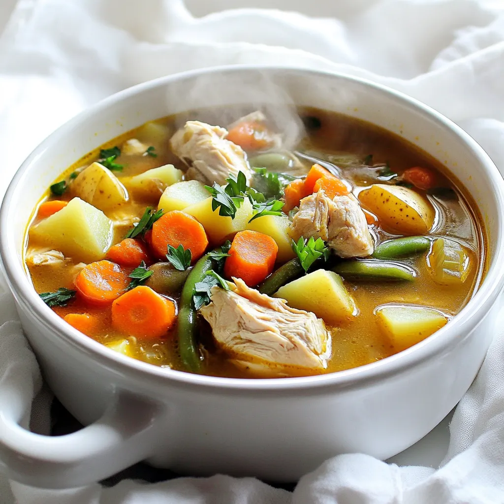 - Chicken thighs: I prefer boneless, skinless chicken thighs. They stay juicy and tender. Cut them into bite-sized pieces. One pound works well for this recipe. - Vegetables: I use a mix of fresh and frozen veggies. Dice two medium carrots and two medium potatoes. Trim and halve one cup of green beans. Chop one onion and mince three cloves of garlic. - Herbs and Spices: I add rich flavors with herbs. Use one teaspoon each of dried thyme and dried rosemary. A bay leaf adds depth. Don’t forget salt and pepper to taste. - Fresh parsley: I love to garnish my soup with chopped fresh parsley. It adds a pop of color and freshness. - Additional spices: If you like more heat, consider adding red pepper flakes or a dash of paprika. These can enhance the soup’s flavor profile. This combination of ingredients creates a warm, hearty soup. Each bite bursts with flavor. The slow cooker does the magic, blending all these tastes over time. Sautéing the onion and garlic Start by heating olive oil in a skillet over medium heat. Add the chopped onion and minced garlic. Stir them for about 3-4 minutes. You want them fragrant and soft. This step builds a strong flavor base for the soup. Preparing chicken and vegetables Next, cut the chicken thighs into bite-sized pieces. Dice the carrots and potatoes. Trim and halve the green beans. Make sure all the vegetables are uniform in size. This helps them cook evenly in the slow cooker. Transferring ingredients to the slow cooker Once your prep is done, transfer the sautéed onion and garlic into the slow cooker. Then, add the chicken pieces, diced carrots, potatoes, and green beans. Pour in the chicken broth. Stir in the dried thyme, rosemary, and bay leaf. Season with salt and pepper to your taste. Cooking time and settings Cover the slow cooker and set it on low for 6-8 hours. If you’re short on time, you can set it on high for 3-4 hours instead. The long, slow cooking helps all the flavors blend beautifully. Adding frozen peas About 30 minutes before you are ready to serve, stir in the frozen peas. They add a pop of color and sweetness to the soup. Adjusting seasoning before serving Before serving, remove the bay leaf. Taste the soup and adjust the seasoning if needed. It’s all about making it perfect for your palate. Serve hot, garnished with fresh chopped parsley. Enjoy your warming bowl of rustic chicken and vegetable soup! How do you enhance taste with herbs? Start by using fresh herbs when possible. Fresh parsley adds a bright taste at the end. Dried thyme and rosemary work well too. They bring warmth and depth to the soup. Just remember, you only need a small amount. Why is low sodium broth important? Low sodium broth allows you to control salt levels. It lets the natural flavors of the chicken and veggies shine. When you use low sodium broth, you can add salt to taste. This helps avoid a soup that is too salty. What are the optimal cooking times for tenderness? For the best results, cook on low for 6-8 hours. This slow cooking makes the chicken tender and juicy. If you’re short on time, cooking on high for 3-4 hours works too. Just keep an eye on the chicken. How do you avoid overcooked vegetables? Add heartier veggies like carrots and potatoes first. They need more time to cook. Add softer vegetables like peas later, about 30 minutes before serving. This keeps them bright and firm, adding great texture to the soup. {{image_2}} You can easily change the protein in this soup. Instead of chicken, try turkey or beef. Both add rich flavor. You can also use cooked beans for a meat-free option. Switching up the vegetables keeps things fresh. Use seasonal veggies like zucchini or bell peppers. They will add bright colors and unique tastes. You can even use leftover veggies you have at home. Just chop them up and toss them in. To spice things up, add red pepper flakes or diced jalapeños. This gives your soup a nice kick. You can adjust the amount to suit your taste. You can also play with herbs and spices. Try adding smoked paprika for a deeper flavor. Fresh herbs like basil or cilantro can brighten the soup. Experiment with your favorites to find what you love best. To store leftovers, wait until the soup cools. Then, place it in containers. Use airtight containers to keep the soup fresh. I recommend using glass or BPA-free plastic containers. This way, you can heat it up later without worry. For freezing soup, first let it cool completely. Then, pour the soup into freezer-safe bags. Leave some space in the bags for expansion. Seal them tightly and label with the date. To thaw, move the bag to the fridge overnight. Reheat on the stove or in the microwave until hot. Enjoy your soup even weeks later! Can I make this soup in advance? Yes, you can make this soup a day or two ahead. It tastes great after sitting. Just store it in the fridge. Reheat it on the stove or in the microwave. How do I thicken the soup? To thicken the soup, you can mash some of the potatoes. You can also add a cornstarch slurry. Mix one tablespoon of cornstarch with two tablespoons of water. Stir it in and cook for a few more minutes. Can I substitute fresh vegetables for frozen? Yes, you can use fresh vegetables. Just chop them and add them to the slow cooker. Fresh veggies may cook a bit faster, so check them after a few hours. Is this soup healthy? Yes, this soup is healthy. It has lean chicken and lots of veggies. It is low in sodium if you choose low-sodium broth. Allergen concerns (e.g., gluten, dairy) This soup is gluten-free and dairy-free. Use gluten-free broth to be sure. Always check labels if you have food allergies. This blog post covered how to make a delicious soup using chicken thighs, vegetables, and herbs. We discussed preparing the ingredients, slow cooking, and adding final touches. I shared tips for enhancing flavor and offered various ingredient swaps. In closing, enjoy experimenting with this soup. You can adjust the spices and vegetables to fit your taste. R