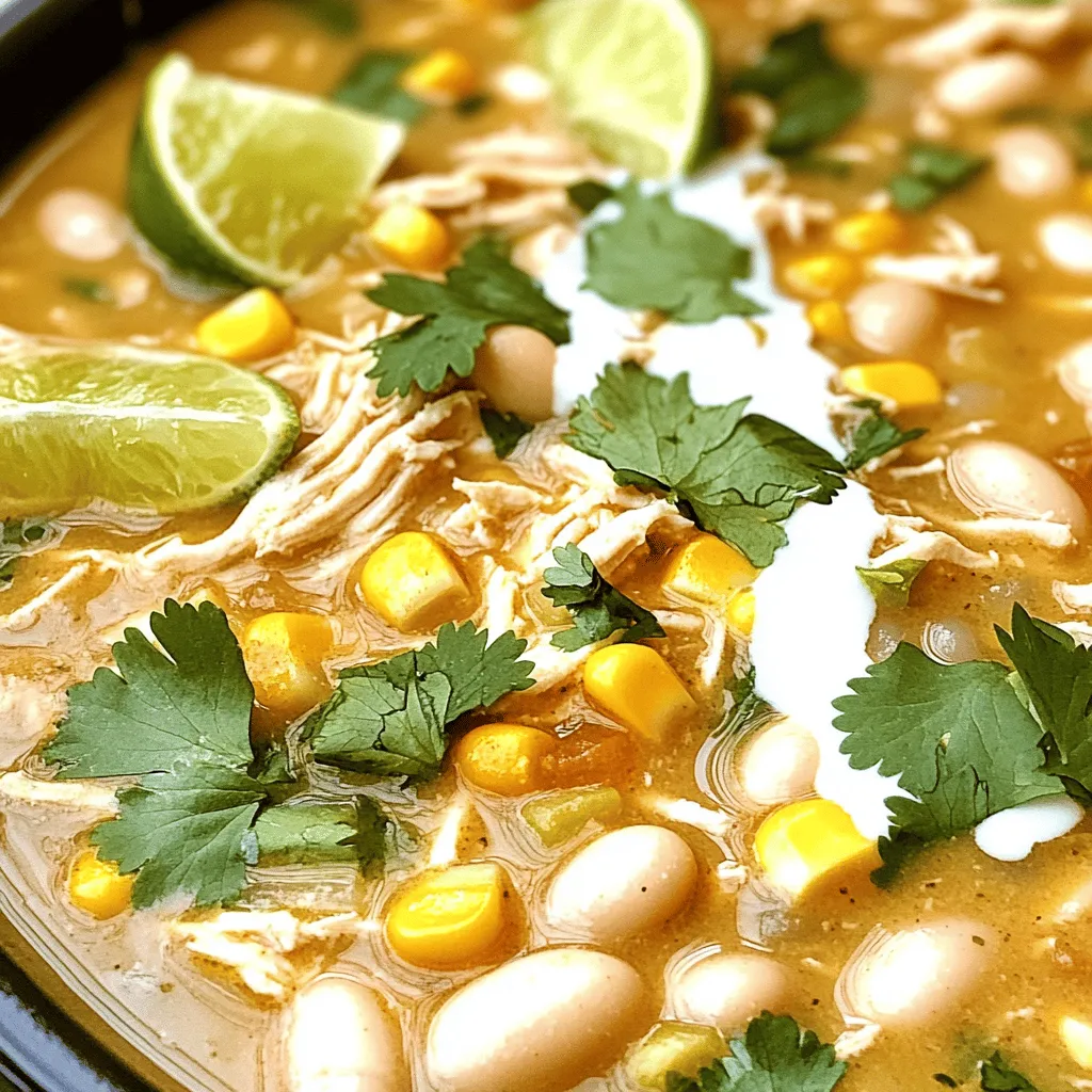 Here are the main ingredients you need for this white chicken chili: - 1 lb boneless, skinless chicken breasts - 1 can (15 oz) white beans, drained and rinsed - 1 can (4 oz) diced green chilies - 1 medium onion, chopped - 2 cloves garlic, minced - 1 cup corn (fresh or frozen) - 2 cups chicken broth - 1 teaspoon ground cumin - 1 teaspoon chili powder - 1 teaspoon dried oregano - Salt and pepper, to taste - 1/2 cup heavy cream (or coconut milk for a dairy-free option) - Fresh cilantro, chopped (for garnish) - Lime wedges (for serving) You can add extra toppings to make your chili even better: - Sour cream for creaminess - Avocado slices for a fresh taste - Shredded cheese for added flavor - Jalapeños for some heat - Tortilla chips for a crunchy side This recipe can fit many diets: - Dairy-free: Use coconut milk instead of heavy cream. - Gluten-free: All ingredients are gluten-free, so enjoy without worry. - Low-carb: Skip the corn and focus on chicken and beans for a low-carb option. Start by placing the boneless chicken breasts in your slow cooker. This helps to keep the chicken moist. Next, add the drained white beans, diced green chilies, and chopped onion. Toss in the minced garlic and corn as well. These ingredients build flavor and texture. Pour the chicken broth over everything. Finally, sprinkle the cumin, chili powder, oregano, salt, and pepper on top. This gives the chili a nice kick. You can set your slow cooker to low heat for 6-7 hours. This slow cooking makes the chicken tender and allows all the flavors to blend well. If you're short on time, use high heat for 3-4 hours. Both methods work, but low heat is best for deep flavor. Always make sure the chicken is cooked through before moving on. Once the chicken is done, take it out and shred it with two forks. This makes it easy to mix back in. Return the shredded chicken to the slow cooker. Now, stir in the heavy cream or coconut milk. This step makes the chili creamy and rich. Let it cook for an additional 15-20 minutes on low heat. This warms everything through and ensures a smooth texture. Taste your chili and adjust the seasoning if needed. To boost the taste of your chili, try these simple seasoning hacks. Use fresh herbs like cilantro for a bright touch. If you like heat, add diced jalapeños or a splash of hot sauce. A squeeze of lime juice adds a nice zing too. You can swap out the cumin for smoked paprika for a deeper flavor. If you want a creamy twist, add more heavy cream or use coconut milk for a dairy-free option. Using the right tools makes cooking easier. A good slow cooker is key for this dish. I recommend one with a timer so you can set it and forget it. Use a meat thermometer to check the chicken's doneness. This helps ensure it is safe to eat. A sturdy pair of tongs is great for shredding chicken. A ladle makes serving easier, too. Serving your chili well makes it more fun. Ladle the chili into bowls and sprinkle fresh cilantro on top. This gives it a pop of color. Add lime wedges on the side for a fresh burst. You can also use a dollop of sour cream or avocado slices for added creaminess. These touches make the dish look inviting and tasty! {{image_2}} You can add heat to your white chicken chili in fun ways. Jalapeños are a great choice. Chop them up and mix them in. You can also use hot sauce. Just a dash can bring a nice kick. If you like it really spicy, add a few slices of fresh chili on top when serving. This lets everyone spice it to their taste. If you're not in the mood for chicken, try turkey instead. Ground turkey works well and tastes great. You can also use tofu for a meat-free option. Firm tofu holds its shape, so cube it and mix it in. Both options make the dish hearty and satisfying. You can switch up the beans too! While white beans are the star here, other beans can shine as well. Black beans add a nice color and flavor. Kidney beans are another option. They bring a different texture and work well in chili. Use what you have on hand, and it will still taste amazing. To store leftover chili, let it cool down first. Then, place it in an airtight container. Keep it in the fridge. This helps maintain its flavor and texture. Leftover chili can last for about 3 to 4 days in the fridge. You can freeze white chicken chili for longer storage. Pour the cooled chili into a freezer-safe container. Leave some space at the top for expansion. Seal it tightly. When ready to eat, thaw it overnight in the fridge. To reheat, warm it on the stove or in the microwave. In the fridge, your chili lasts about 3 to 4 days. If frozen, it can last for up to 3 months. However, for the best taste, try to eat it sooner. Yes, you can use frozen chicken in this recipe. The slow cooker will cook it safely. Just make sure to cook it longer. If you use frozen chicken, set the slow cooker on high for about 4-5 hours. If you use thawed chicken, it will cook well on low for 6-7 hours. Both methods give tender chicken. To thicken your chili, try a few simple methods. One way is to mash some of the white beans. This adds body and creaminess. Another way is to let it cook longer with the lid off. This helps some liquid evaporate. You can also stir in a bit of cornmeal or flour mixed with water. This adds thickness without changing the taste much. Yes, you can prep this chili ahead of time. Chop the veggies and store them in the fridge. You can also season the chicken and beans in advance. Just keep everything in separate containers. On cooking day, just add them to the slow cooker. This saves time and makes it easy to enjoy a warm meal. This blog post explored the essentials for making the perfect chili. We covered required and optional ingredients, plus dietary needs. You learned how to prepare the slow cooker, adjust temperatures, and add final touches. I shared tips for flavor, tools, and presentation. We also looked at variations and storage methods to keep your chili fresh. Chili is simple to customize and perfect for gather