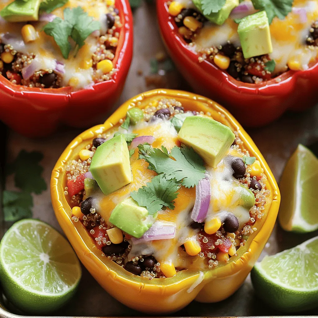 These ingredients create a tasty and colorful meal. I love using fresh bell peppers. They add a crunch and bright flavor. Quinoa is my go-to for a healthy base. It is packed with protein and fiber.