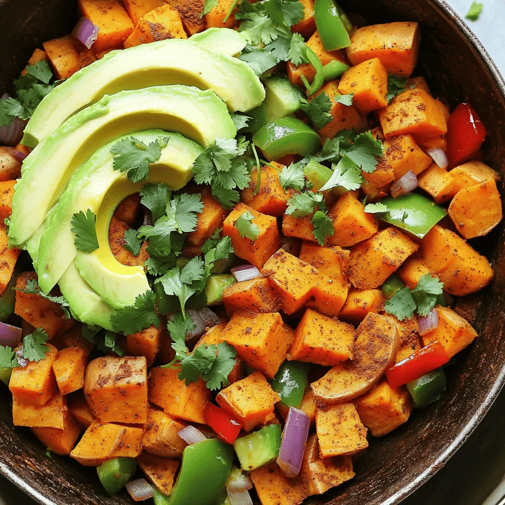 - 2 medium sweet potatoes, diced - 1 red bell pepper, chopped - 1 green bell pepper, chopped - 1 small red onion, diced - 2 cloves garlic, minced - 1 teaspoon cumin - 1 teaspoon smoked paprika - 1/2 teaspoon chili powder - Salt and pepper to taste - 1 can black beans, drained and rinsed - 1 cup corn (frozen or fresh) - 2 tablespoons olive oil - Fresh cilantro, chopped (for garnish) - Avocado slices (for topping) Gathering the right ingredients is key to a tasty dish. For this Southwest Sweet Potato Skillet, start with fresh sweet potatoes. They bring natural sweetness and a smooth texture. You will also need vibrant bell peppers. These not only add color but also a nice crunch. Next, don’t forget the onion and garlic. They give a great base flavor. To make it spicy and warm, use cumin, smoked paprika, and chili powder. Adjust the salt and pepper to your taste. Black beans and corn are important for texture and nutrition. They make the dish hearty and filling. Olive oil is crucial too. It helps cook the veggies and adds a rich taste. Lastly, add fresh cilantro and avocado for garnish. They bring brightness and freshness to the meal. You can find the full recipe in the earlier section. Enjoy cooking! Start by heating 2 tablespoons of olive oil in a large skillet over medium heat. Add the diced sweet potatoes. Season them with salt and pepper. Cook for about 10 to 15 minutes. Stir occasionally. You want them soft but not mushy. Check for doneness by piercing with a fork. They should be tender enough to mash slightly. Once the sweet potatoes are soft, add the diced red onion and chopped bell peppers. Keep the heat at medium. Cook these veggies for about 5 to 7 minutes. Stir them often. You want them to become tender and vibrant. They should not lose their color. Now it's time to add flavor. Stir in the minced garlic first. Add the cumin, smoked paprika, and chili powder next. Cook for 1 to 2 minutes. This helps release all the lovely aromas. If you like more heat, add extra chili powder to fit your taste. Next, add the drained black beans and corn into the skillet. Mix everything well. Use a spatula to make sure all ingredients are combined. Cook for an additional 5 minutes. This will heat everything through. Taste it and adjust seasoning if needed. To serve, spoon the mixture onto plates. For a fresh touch, top with avocado slices and chopped cilantro. This adds a nice contrast to the warm dish. You can also use a colorful plate for a beautiful presentation. Enjoy your meal! For the complete details, check [Full Recipe]. To get sweet potatoes just right, look for a few signs. They should be tender when you poke them with a fork. You want a nice balance of crunch and softness in your veggies. For bell peppers, they should still have a bit of crunch. This gives your skillet a nice mix of textures. Spices can change everything. If you don’t have cumin, try coriander instead. For extra flavor, think about toppings. A squeeze of lime juice or some feta cheese can really lift the dish. Fresh herbs like cilantro add brightness too. Prepping in advance saves time. You can chop your veggies a day before and keep them in the fridge. This makes cooking faster. When reheating, do it slowly on low heat. This keeps the sweet potatoes soft and tasty. If using the microwave, cover the skillet to keep moisture in. {{image_2}} You can boost your Southwest Sweet Potato Skillet by adding protein. Chicken, beef, or tofu work well. If you choose chicken, cut it into small pieces. Cook it first in the skillet until it's brown. For beef, use ground beef or small cubes. Cook it the same way as chicken. Tofu is a great vegetarian option. Press and cube the tofu. Sauté it until golden. Adjust cooking time as needed. Make sure the protein is fully cooked before adding vegetables. For a vegetarian or vegan twist, swap out cheese or add more veggies. Use cashew cheese or nutritional yeast for a cheesy taste. You can also add spinach, zucchini, or mushrooms. These will boost the flavor and nutrition. To bring in more flavor without meat, use vegetable broth or miso paste. This adds depth to the dish. You won’t miss the meat! If you love heat, make your skillet spicy. You can add crushed red pepper or cayenne pepper for more kick. Stir in these spices while cooking garlic. This will infuse the dish with heat. For an extra spicy touch, try hot sauce. Add it while cooking or as a topping. Fresh jalapeños or serrano peppers also add flavor. Just slice them thin and mix them in. Adjust the amount based on your spice level preference. To store leftovers, let the skillet cool down first. Place the dish in an airtight container. This keeps the flavors fresh. You can keep it in the fridge for up to four days. If you want to enjoy it later, try to use it quickly for the best taste. Freezing is a great way to keep this meal longer. First, cool the dish completely. Then, transfer it to a freezer-safe container. Make sure to leave some space at the top, as it will expand. You can freeze it for up to three months. When you’re ready to eat, just take it out of the freezer and place it in the fridge overnight. To reheat, the best method is using the stovetop. Heat it in a skillet over medium heat. Stir it often to keep it from sticking. It usually takes about 10 minutes to heat through. If you want to use a microwave, place it in a safe dish and cover it. Heat in 1-minute intervals, stirring in between. This helps keep the texture nice and warm. It takes about 35 minutes to make this dish. You spend 10 minutes prepping the veggies. The cooking time is around 25 minutes. This makes it a quick meal for busy days. Yes, you can use other potatoes. Regular potatoes, like russet or Yukon gold, work well. However, they have a different taste and texture. Sweet potatoes are sweeter and creamier. They also add more color and nutrition to the dish. You can serve this skillet with many sides. A fresh salad pairs well with it. You might a