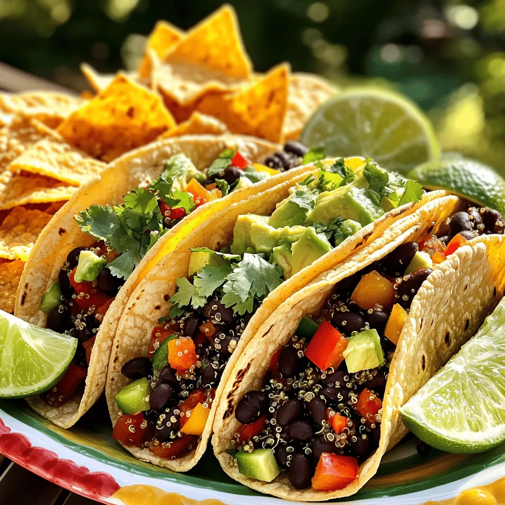 To make my spicy black bean quinoa tacos, you need a few key ingredients. Here’s what you'll gather: - 1 cup quinoa, rinsed - 2 cups vegetable broth - 1 can (15 oz) black beans, rinsed and drained - 1 bell pepper (any color), diced - 1 small red onion, diced - 2 cloves garlic, minced - 1 teaspoon cumin - 1 teaspoon smoked paprika - 1/2 teaspoon cayenne pepper (adjust to taste) - 1 tablespoon olive oil - Salt and pepper to taste - 8 small corn tortillas These ingredients work together to create a tasty and filling dish. Each bite packs a punch of flavor. You can dress up your tacos with fun toppings. Here are some ideas to make them even better: - Diced avocado - Chopped cilantro - Lime wedges - Salsa Adding these toppings gives your tacos extra freshness and crunch. Feel free to mix and match based on your taste! These tacos are not just delicious; they are also good for you. Here is a quick look at the nutrition: - Calories: About 300 per serving - Protein: 12g - Fiber: 10g - Fat: 8g They are loaded with protein and fiber, making them a great choice for a healthy meal. Enjoy the flavors and benefits of this easy, flavorful dish! For the full recipe, check out the link. To cook the quinoa, start by rinsing 1 cup of quinoa in cold water. This removes any bitter taste. In a medium saucepan, combine the rinsed quinoa with 2 cups of vegetable broth. Bring it to a boil. After it boils, reduce the heat to low. Cover the pot and let it simmer for about 15 minutes. The quinoa is done when all the liquid is absorbed. Fluff the quinoa with a fork and set it aside. Next, we’ll make the black bean mixture. In a skillet, heat 1 tablespoon of olive oil over medium heat. Add 1 diced red onion and 1 diced bell pepper. Sauté them for about 5 minutes until they are soft. Then, add 2 minced garlic cloves, 1 teaspoon of cumin, 1 teaspoon of smoked paprika, and 1/2 teaspoon of cayenne pepper. Stir these together for about a minute. This will bring out the flavors. Now, add 1 can of black beans, rinsed and drained. Cook for another 5 minutes to heat the beans and soak in the spices. Now comes the fun part—assembling the tacos! In a large bowl, mix the cooked quinoa with the black bean mixture. Stir well to combine. Then, warm 8 small corn tortillas in a dry skillet over low heat for about 30 seconds on each side. To build each taco, spoon a good amount of the quinoa-black bean mix onto a tortilla. Top it with diced avocado, chopped cilantro, a squeeze of lime, and your favorite salsa. Enjoy your tasty creation! Check the Full Recipe for more details! To cook quinoa perfectly, start with rinsing it. Rinsing removes the bitter saponins. Use a 2:1 ratio of vegetable broth to quinoa. Bring it to a boil, then lower the heat. Cover it and let it simmer for about 15 minutes. After the time, fluff it with a fork. This keeps it light and airy. You can boost the flavor of your quinoa mix easily. Add more spices, like garlic or cumin, to suit your taste. If you like heat, increase the cayenne pepper. For a smoky flavor, add a bit more smoked paprika. Taste as you go. Adjust until it’s just right for you. To make your tacos look great, use a colorful platter. Place the tacos neatly on the dish. Garnish with lime wedges and cilantro. This adds color and freshness. You can also serve tortilla chips on the side. This gives a nice crunch and makes the meal more fun. For the complete recipe, check out the Full Recipe. {{image_2}} To make these tacos vegan, simply stick with the ingredients listed. The recipe is already dairy-free, so you can enjoy it guilt-free! For gluten-free options, use corn tortillas as the base. They pair perfectly with the filling. Always check the labels on your tortillas to ensure they are gluten-free. While black beans are the star here, feel free to swap them out. You can use pinto beans, kidney beans, or even chickpeas. Each bean brings its own flavor and texture. Experimenting with beans can change the taste of your tacos and add fun twists. Want to jazz up your tacos? Adding veggies is a great idea! Consider corn, zucchini, or spinach. These add more color and nutrients. If you want extra protein, shredded chicken or tofu also works well. Just cook them with the spices to blend the flavors. For the full recipe, check out the Spicy Black Bean Quinoa Tacos. Enjoy crafting your delicious variations! To store leftover tacos, place them in an airtight container. Keep them in the fridge for up to three days. If you have extra filling, store it separately. This keeps the tortillas from getting soggy. For reheating, use a skillet. Heat over medium heat, and warm the tacos for about 2-3 minutes. This keeps the tortillas crispy. You can also microwave them. Place a damp paper towel over the tacos and heat for about 30 seconds. Check to see if they are warm enough. You can freeze the black bean quinoa filling. Allow it to cool completely first. Then, place it in a freezer-safe bag or container. It will last up to three months in the freezer. When ready to eat, thaw it in the fridge overnight. Reheat it in a skillet before serving with fresh tortillas. For the best taste, do not freeze the assembled tacos. Yes, you can! Brown rice or farro works well. Both add nice texture. You can also try millet or couscous for a different feel. Just make sure to adjust the cooking times. Each grain has its own needs. If you use rice, follow the package directions for water. The goal is to have a fluffy base for the tacos. To turn up the heat, add more cayenne pepper. You can also toss in some diced jalapeños. Fresh or pickled jalapeños add a nice crunch too. Another option is to use a spicy salsa as a topping. If you like heat, try a drizzle of hot sauce. Just be careful—add spice slowly to avoid overwhelming flavors. Tacos pair well with many sides. Consider serving them with tortilla chips and salsa. A fresh salad with lime dressing is also nice. You might enjoy some roasted vegetables for a hearty side. F