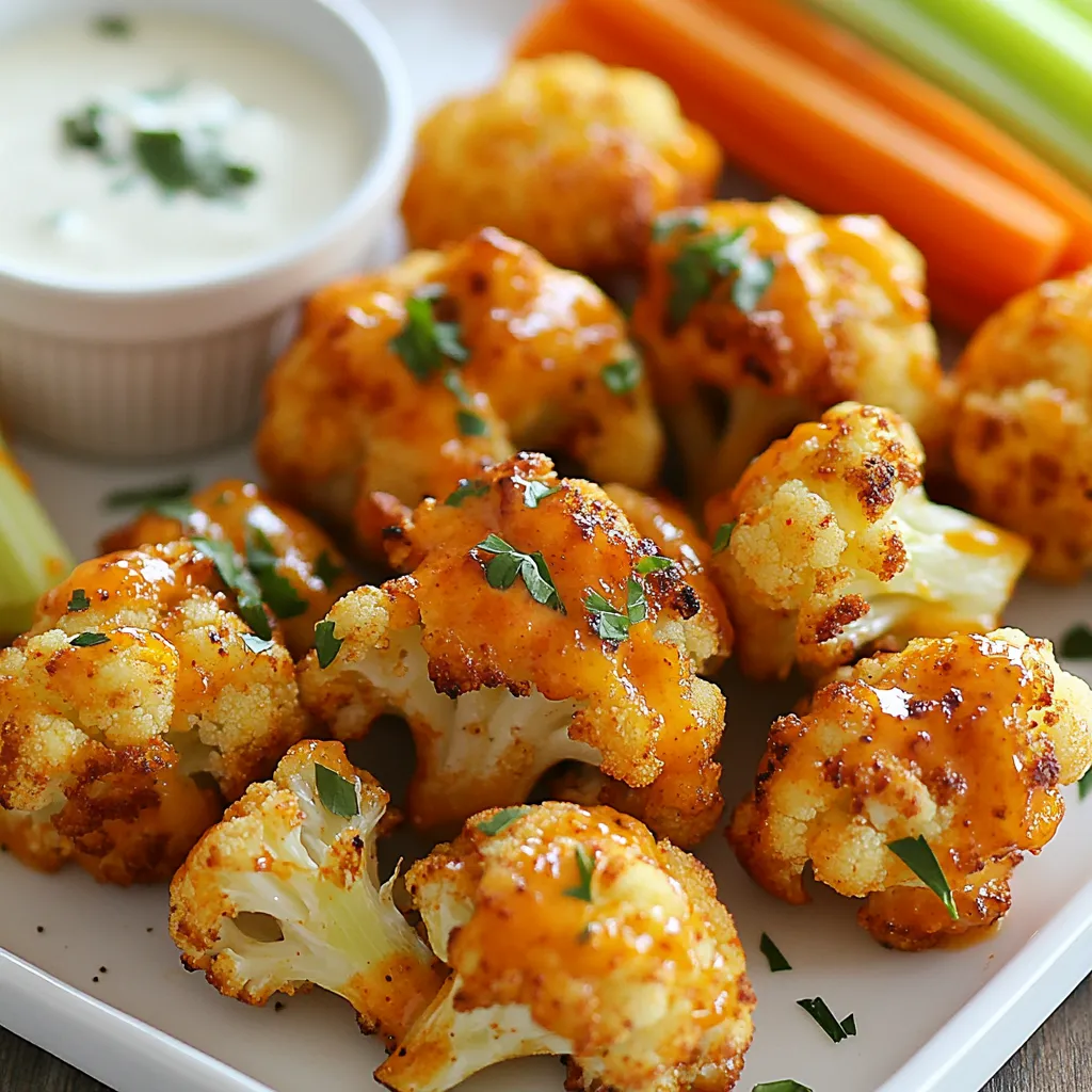 Crispy cauliflower florets coated in a spicy buffalo sauce, perfect as an appetizer or snack.