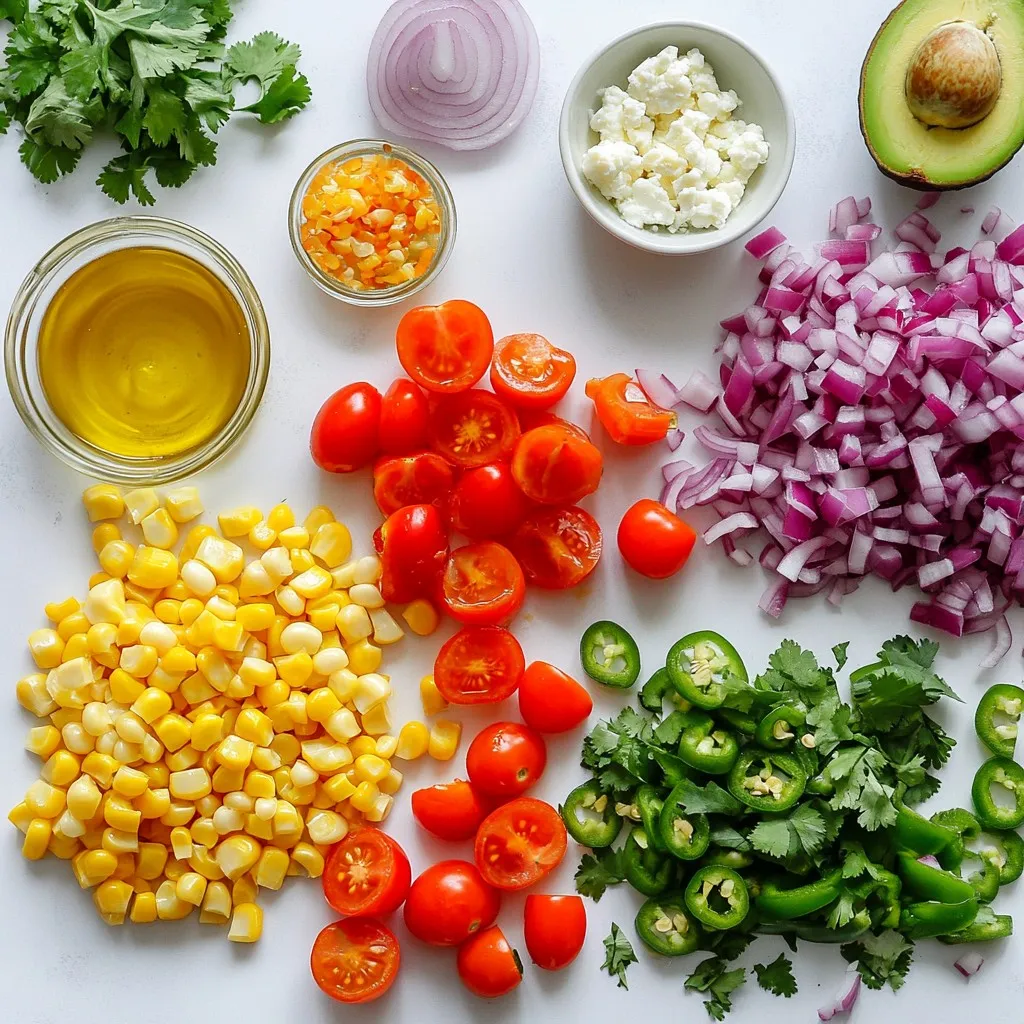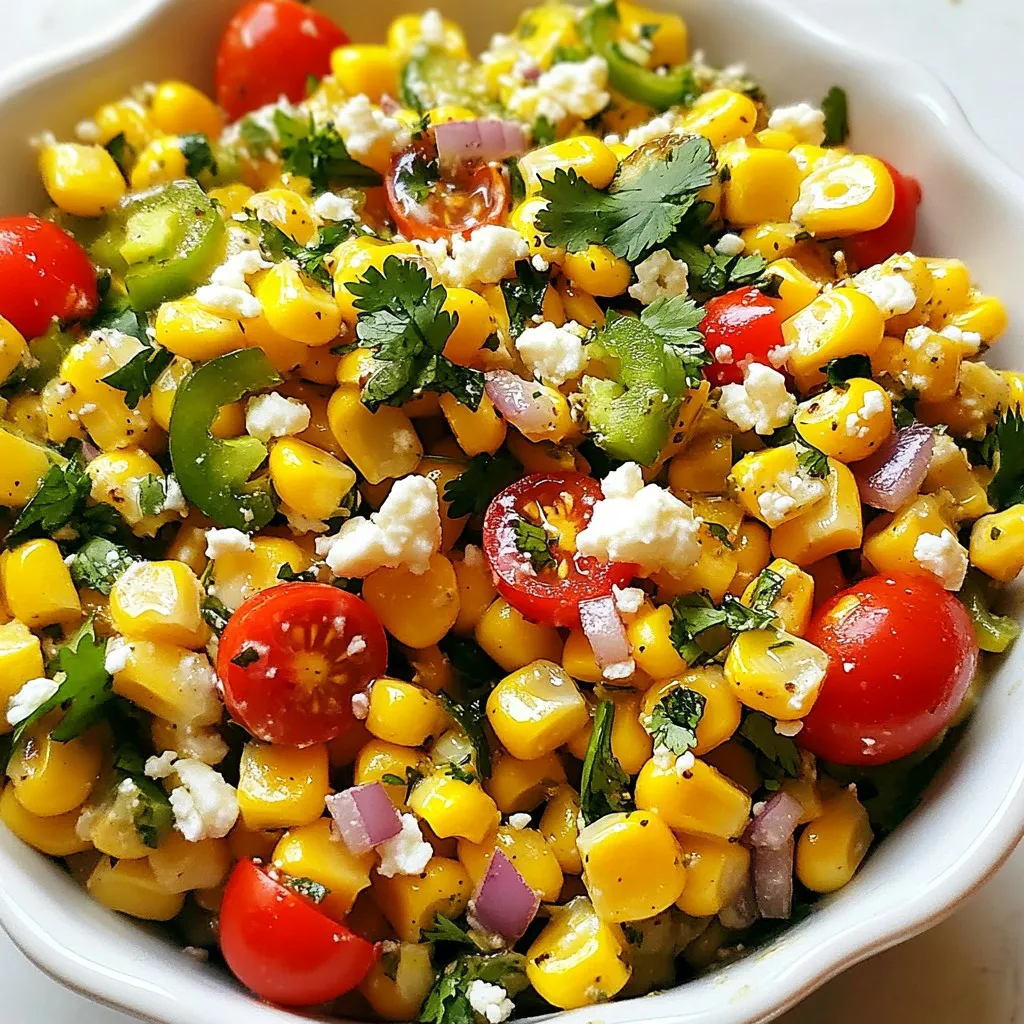 - 4 ears of fresh corn - 1 red bell pepper - 1 small jalapeño - 1/2 cup red onion - 1/2 cup cherry tomatoes - 1/4 cup fresh cilantro - 3 tablespoons lime juice - 2 tablespoons olive oil - 1 teaspoon honey - Salt and pepper to taste - Crumbled feta cheese - Diced avocado The fresh ingredients in this Spicy Cilantro Lime Corn Salad make it vibrant and tasty. Start with the corn. I love using fresh corn because it gives the best flavor and crunch. You can use four ears. Next, grab a red bell pepper. It adds a sweet and crisp bite. A small jalapeño adds heat. Just remove the seeds for less spice. Cut up a half cup of red onion for a sharp taste. Add half a cup of cherry tomatoes for juicy bursts of flavor. Finally, toss in a quarter cup of chopped cilantro. It gives the salad a fresh herbal note. For the dressing, mix three tablespoons of lime juice with two tablespoons of olive oil. Add one teaspoon of honey for a touch of sweetness. Season it all with salt and pepper to your taste. If you want to go the extra mile, top it off with crumbled feta cheese or diced avocado. These toppings add creaminess and richness. Enjoy making this salad. It’s a great way to bring fresh flavors together! {{ingredient_image_1}} - Boiling the corn: Start by boiling a large pot of water. When the water boils, add the husked corn. Cook for 5-7 minutes until the corn is tender. - Cooling and slicing corn kernels: Remove the corn from the pot. Let it cool for a few minutes. Once cool, cut the kernels off the cob and place them in a big mixing bowl. - Combining vegetables in a bowl: Add the diced red bell pepper, minced jalapeño, finely chopped red onion, halved cherry tomatoes, and chopped cilantro to the bowl with corn. Mix well. - Preparing the dressing in a separate bowl: In a small bowl, whisk together lime juice, olive oil, honey, salt, and pepper. Make sure it’s well blended. - Tossing the salad and adjusting flavors: Pour the dressing over the corn mixture. Toss everything gently to combine. Taste and adjust seasoning if needed. - Adding optional toppings: If you want, sprinkle crumbled feta cheese or diced avocado on top before you serve. Enjoy your colorful, fresh salad! Choosing the right corn Fresh corn is best for this salad. Look for corn with bright green husks. The kernels should feel plump and firm. Sweet corn adds great flavor. If fresh corn is not available, canned or frozen corn can work. Adjusting spice levels with jalapeño The jalapeño adds heat. You can control the spice by removing all seeds. If you want more heat, leave some seeds in. For less spice, use a milder pepper or omit it altogether. Adding more vegetables or herbs You can boost flavors by adding more veggies. Try diced cucumbers or radishes for crunch. Fresh herbs like parsley or basil also add freshness. Mix and match to find your favorite combination. Utilizing fresh lime versus bottled juice Fresh lime juice makes the salad bright and zesty. Bottled lime juice lacks flavor and freshness. Always choose fresh when possible for the best taste. Best pairings for the salad This salad pairs well with grilled meats or fish. It also complements tacos or burritos nicely. Serve it as a side dish at barbecues for a colorful addition. Ideal serving temperature Serve the salad cold or at room temperature. Chilling it for a bit enhances the flavors. If made ahead, let it sit in the fridge for at least an hour before serving. Pro Tips Choose Fresh Corn: The fresher the corn, the sweeter and more flavorful your salad will be. Look for bright, green husks and plump kernels. Adjust the Heat: If you prefer a milder salad, reduce or omit the jalapeño. For extra heat, leave the seeds in or add more jalapeño. Make it Ahead: This salad can be made a few hours in advance. Just keep it covered in the refrigerator to allow the flavors to meld without getting soggy. Experiment with Toppings: Try adding other toppings like diced avocados, crumbled queso fresco, or even nuts for added texture and flavor. {{image_2}} You can boost the salad’s flavor and nutrition by adding proteins. Grilled chicken makes a great addition. Just slice it thin and mix it in. The chicken adds a hearty touch that pairs well with the corn. Shrimp variations work nicely too. Grilling or sautéing shrimp brings a lovely taste. Toss the shrimp in with the other ingredients for a seafood twist. For those who prefer a vegetarian dish, this salad is already perfect. It uses fresh veggies and herbs for a colorful mix. To make it gluten-free, be sure to check the honey and any toppings. Most ingredients work well for gluten-free diets. You can also change the salad based on the season. In summer, fresh corn shines as the star. Add ripe tomatoes and cucumbers for extra crunch. In winter, switch to heartier veggies like roasted squash or steamed green beans. Seasonal herbs like basil or mint can also add a fresh twist. Mixing these ingredients keeps the dish exciting all year long. To keep your Spicy Cilantro Lime Corn Salad fresh, store it in the fridge. Use a tight container to lock in the flavors. Glass or BPA-free plastic containers are great choices. Make sure to seal the lid well. This helps keep out air and moisture. You can eat this salad cold, but if you want to warm it up, use the stovetop. Gently heat it in a pan for a few minutes. This keeps the flavors bright. Avoid the microwave, as it can make the salad soggy. Your salad will last about 3 to 5 days in the fridge. Check for any off smells or changes in color. If it looks or smells bad, toss it out. Freshness is key to enjoying this tasty dish! Yes, you can use frozen corn. Just thaw it first. Frozen corn has a sweet flavor. It also saves time. This salad has a mild to moderate spice. The jalapeño gives it heat. If you want it less spicy, use less jalapeño. You can also remove the seeds for less heat. You can use maple syrup as a substitute. Agave nectar also works well. Both will add sweetness without changing 