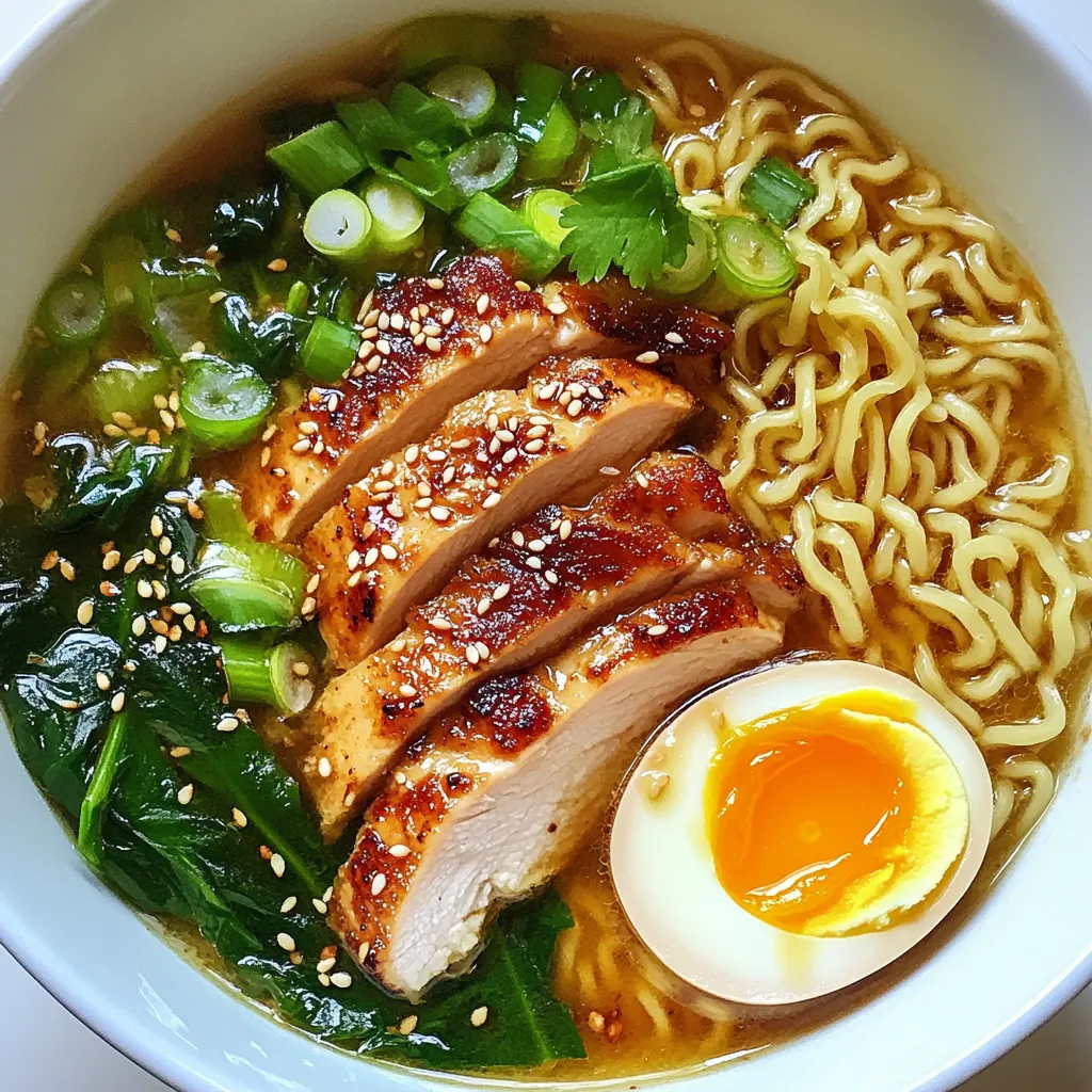 Make your ramen look great! Use shallow bowls to show off the noodles and broth. Place the sliced chicken on top, then add a soft-boiled egg if you like. Sprinkle with toasted sesame seeds and fresh cilantro for color. Chop green onions finely and add them last for a fresh touch. A pretty dish makes every bite more enjoyable.