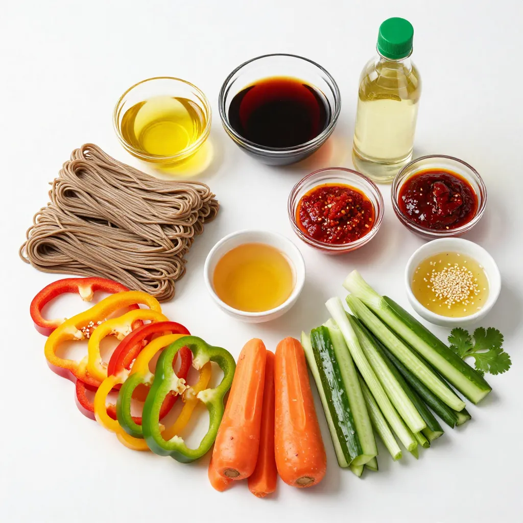 A refreshing and spicy salad featuring soba noodles and colorful vegetables, dressed in a sesame sauce.