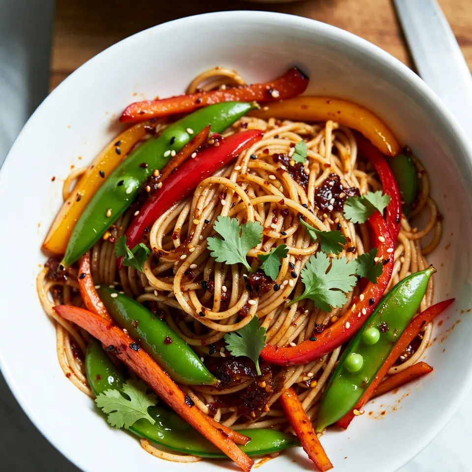 A quick and flavorful stir fry featuring whole wheat noodles, fresh vegetables, and a spicy sesame sauce.