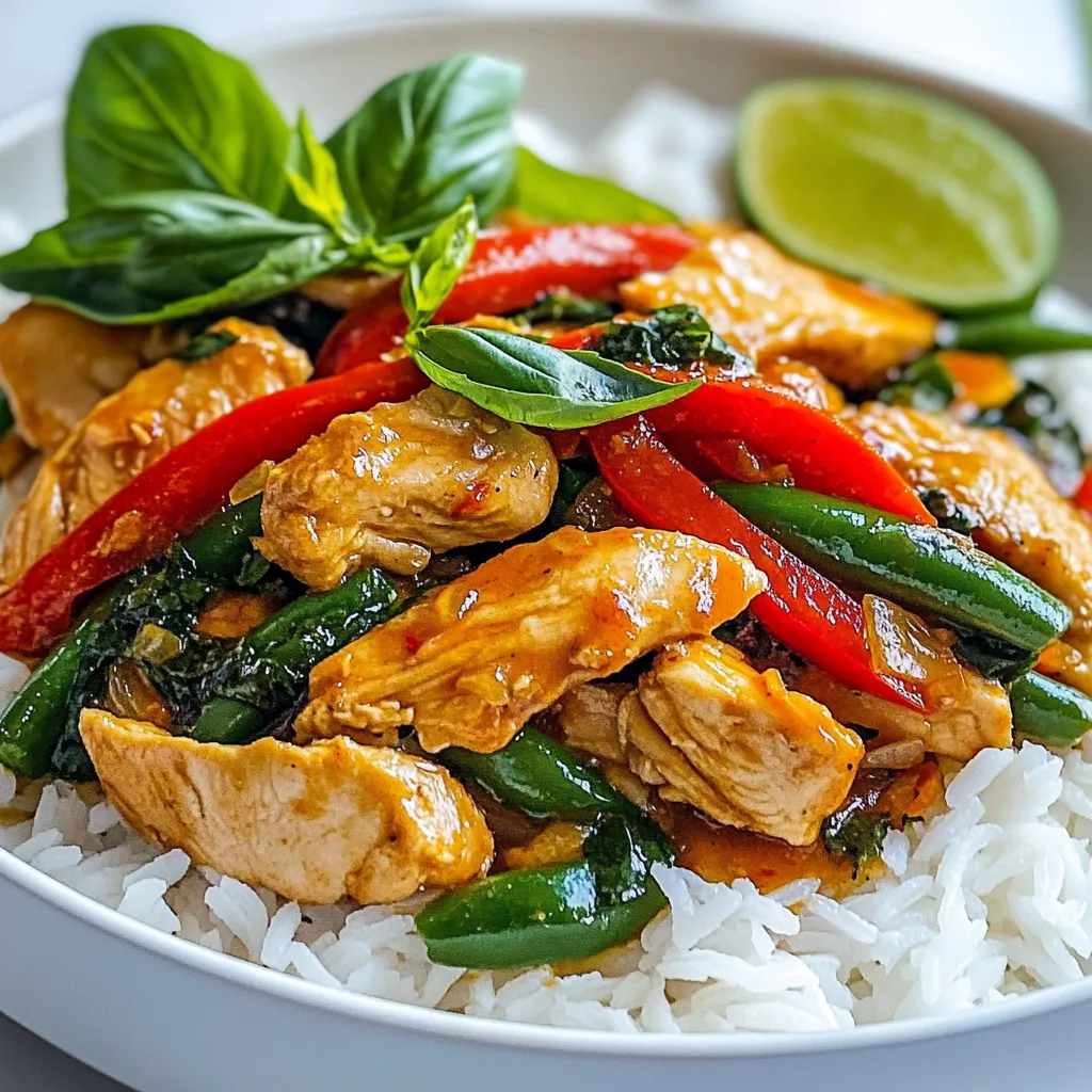 A spicy and aromatic stir-fry featuring chicken, fresh Thai basil, and vibrant vegetables.