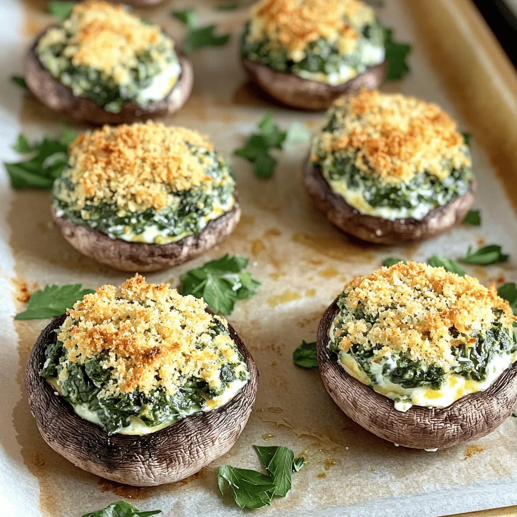 Here’s what you need for spinach stuffed mushrooms: - 12 large portobello mushrooms, stems removed - 2 cups fresh spinach, chopped - 1 cup cream cheese, softened - 1/2 cup grated Parmesan cheese - 1/4 cup breadcrumbs - 2 cloves garlic, minced - 1/4 teaspoon nutmeg - Salt and pepper to taste - 2 tablespoons olive oil - Fresh parsley for garnish You can add your twist to this dish. Here are some ideas: - Crumbled feta cheese for a tangy flavor - Chopped sun-dried tomatoes for a touch of sweetness - Cooked sausage for added protein - Spices like red pepper flakes for heat If you don't have certain ingredients, don’t worry! Here are some swaps: - Use ricotta cheese in place of cream cheese for a lighter filling - Swap portobello mushrooms with button mushrooms for a smaller bite - Use nutritional yeast instead of Parmesan for a vegan option - Replace breadcrumbs with crushed nuts for a gluten-free choice These ingredients work together to create a tasty and filling dish. You can find the full recipe above! Start by cleaning the mushrooms. Use a damp cloth to wipe them. Remove the stems gently. You want a nice cap for stuffing. Brush each cap with olive oil. This adds flavor and helps them cook well. Sprinkle a bit of salt over the caps. Set them aside while you make the filling. Heat a skillet over medium heat. Add one tablespoon of olive oil. Once hot, toss in the minced garlic. Sauté it for about a minute until it smells nice. Next, add the chopped spinach. Stir it around for 2-3 minutes until it wilts. Take it off the heat and let it cool down a bit. In a mixing bowl, add the cream cheese, Parmesan cheese, breadcrumbs, nutmeg, salt, and pepper. Fold in the cooled spinach. Mix it all together until it’s well combined. Take each mushroom cap and fill it with the spinach mix. Pack it in there nicely. Place the stuffed mushrooms on a baking sheet lined with parchment paper. Bake them in the preheated oven at 375°F (190°C) for 20-25 minutes. They should be tender and look golden on top. Once done, take them out and add fresh parsley for a nice touch. Serve them warm and enjoy! You can follow the Full Recipe for more details. To get perfect stuffed mushrooms, start with large portobello mushrooms. Remove the stems gently. You want to create a nice pocket for the filling. Wipe the caps with a damp cloth to clean them. Brush the caps with olive oil to add flavor. This step helps them roast well. Pack the filling in tightly, but don’t overfill. This helps them hold their shape while baking. Use fresh spinach for the best taste. Sautéing the spinach with garlic adds a rich flavor. You can also add some lemon juice for a bright touch. A pinch of nutmeg gives a warm spice that works well with cream cheese. If you like heat, add red pepper flakes. Mix in extra herbs like thyme or basil for more depth. Serve the stuffed mushrooms warm for the best taste. They shine as appetizers at parties. Pair them with a fresh salad for a light meal. You can also serve them alongside pasta or grilled chicken. A glass of white wine complements the dish nicely. For a fun twist, try them on a toasted baguette slice. Enjoy the flavors with friends and family! {{image_2}} You can easily make vegan spinach stuffed mushrooms. Replace cream cheese with cashew cream or tofu. Use nutritional yeast instead of Parmesan for that cheesy taste. Add a splash of lemon juice for a fresh kick. This keeps the rich flavor while being plant-based. If you're gluten-free, switch out regular breadcrumbs for gluten-free ones. You can also use crushed nuts or seeds for a crunchy topping. These swaps keep the taste and texture without gluten. It’s a tasty way to enjoy the dish without worry. Cheese lovers can get creative. Try adding feta cheese for a tangy twist. Mozzarella will give a gooey, melty texture. Goat cheese adds a rich and earthy flavor. Mix and match cheeses to find your favorite combo. This way, each bite brings something new and exciting. For the full recipe, check out Spinach Stuffed Mushrooms. Enjoy the fun of creating your own versions! To store leftover stuffed mushrooms, let them cool down first. Place them in an airtight container. This keeps them fresh and tasty. You can store them in the fridge for up to three days. If you want to enjoy them later, consider freezing them. When you're ready to eat your leftovers, preheat your oven to 350°F (175°C). Place the mushrooms on a baking tray. Cover them with foil to keep them moist. Heat for about 15-20 minutes. Check to see if they are warm all the way through. You can also reheat them in the microwave. Just cover them with a paper towel and heat for 1-2 minutes. To freeze stuffed mushrooms, you can do this before or after baking. If you freeze them before baking, place them on a tray and freeze until solid. Then, transfer them to a freezer bag. They will last for up to three months. If you freeze baked mushrooms, let them cool and follow the same steps. To bake frozen mushrooms, add about 5-10 minutes to your baking time. Enjoy your spinach stuffed mushrooms anytime! For the complete recipe, check the Full Recipe section. Yes, you can make spinach stuffed mushrooms ahead of time. Prepare the filling and stuff the mushrooms. Then, cover them and keep them in the fridge for up to 24 hours. When you're ready, just bake them. This saves you time and makes hosting easy. Spinach stuffed mushrooms pair well with many dishes. Here are a few ideas: - A fresh green salad - Garlic bread or toast - Roasted vegetables - A light pasta dish - Wine, like a crisp white or light red These sides enhance the meal and create a balanced plate. Mushrooms are cooked properly when they are tender and look golden brown. Check them after 20 minutes in the oven. If they are firm, bake them for a few more minutes. The filling should also be warm and slightly bubbly. Always let them cool a bit before serving. Enjoy your meal! For the full recipe, check out the Spinach Stuffed Mushrooms sec