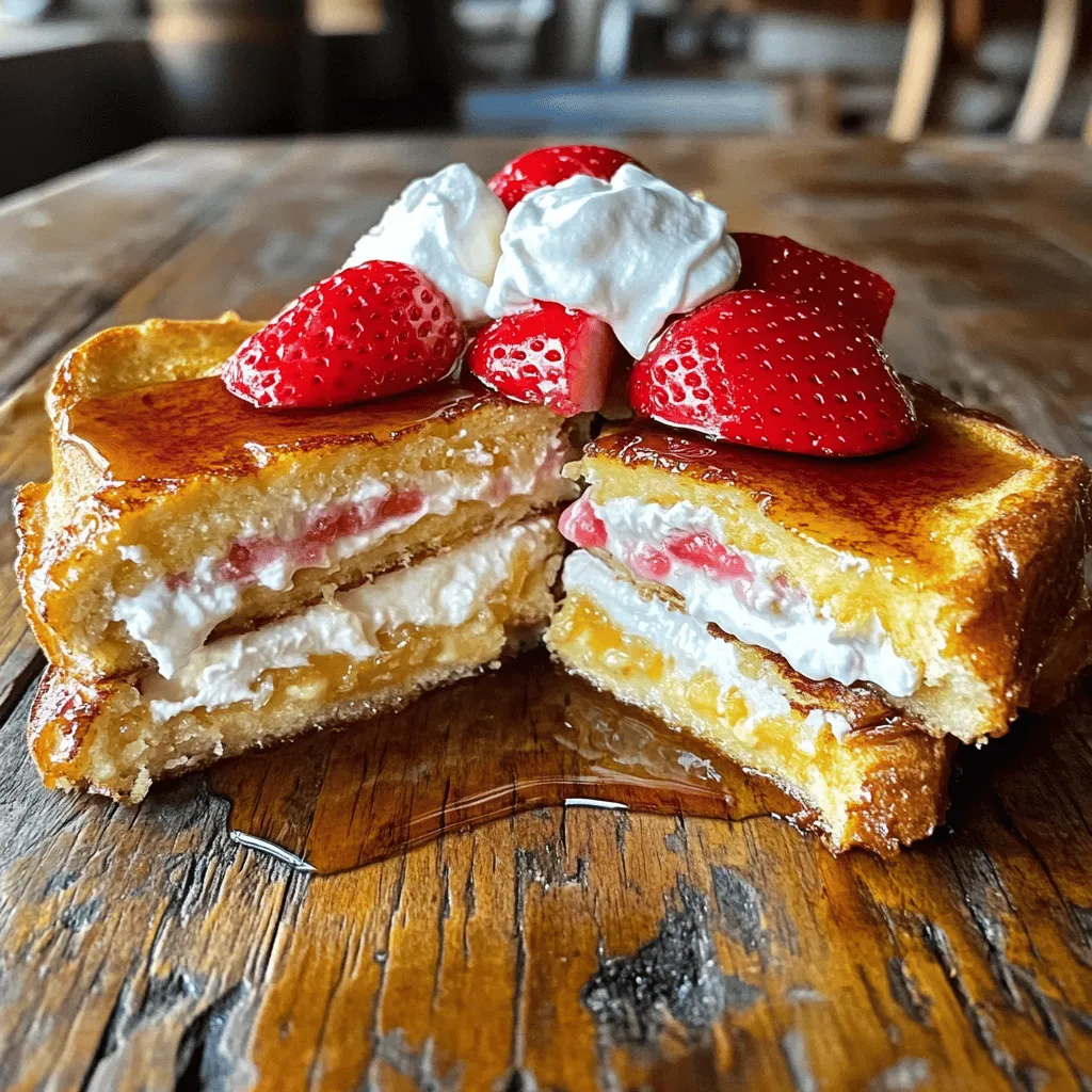 - 6 slices of thick white bread or brioche - 4 ounces cream cheese, softened - 1/4 cup powdered sugar - 1 teaspoon vanilla extract - 2 large eggs - 1/4 cup milk - 1 teaspoon ground cinnamon To make this dish shine, I use thick white bread or brioche. The bread adds a soft, fluffy texture. Next, I blend cream cheese with powdered sugar and vanilla. This mixture gives a sweet and creamy taste. Then, I whisk together eggs, milk, and ground cinnamon. This egg mixture coats the bread and adds flavor. - 1 cup fresh strawberries, hulled and sliced - Maple syrup, for serving - Optional whipped cream, for topping Fresh strawberries are a must for this recipe. They add a bright pop of color and sweetness. I love to drizzle maple syrup over the warm French toast. If you want to make it extra special, add whipped cream on top. It makes the dish feel like a treat! To start, grab a mixing bowl. Combine 4 ounces of softened cream cheese, 1/4 cup of powdered sugar, and 1 teaspoon of vanilla extract. Use a hand mixer or whisk to mix until smooth and creamy. This sweet filling is the heart of your dish. Set it aside while you prepare the next steps. Next, take 6 slices of thick white bread or brioche. Spread a generous layer of the cheesecake mixture on one side of each slice. Then, layer fresh strawberries on top. Make sure to slice 1 cup of strawberries first. After adding the berries, cover with another slice of bread, forming a sandwich. Repeat this for all slices. Now, it's time to cook! In a shallow bowl, whisk together 2 large eggs, 1/4 cup of milk, and 1 teaspoon of ground cinnamon until well combined. Heat a large skillet over medium heat and melt 2 tablespoons of butter. Dip each cheesecake-stuffed sandwich in the egg mixture, coating both sides well. Place the sandwiches in the hot skillet. Cook for about 3-4 minutes on each side until golden brown. Once done, let them rest for a minute before slicing in half. Enjoy your warm, delicious treat! To make the best French toast, use day-old bread. This bread is firmer and soaks up the egg mixture better. Fresh bread can get too soggy. For a great golden crust, heat your skillet to medium. If it’s too hot, the toast will burn. Use enough butter in the pan. This helps create a nice, crispy outer layer. When plating, slice the French toast in half. This makes it easier to eat. Stack the halves for a beautiful look. Add fresh strawberries on top for color and flavor. Drizzle with maple syrup for sweetness. If you want to go the extra mile, add whipped cream. It makes the dish feel special and indulgent. Consider a sprinkle of powdered sugar for extra charm. {{image_2}} You can change the fruit in this recipe. Blueberries and raspberries work great too. Just pick your favorite fruit. You can also use flavored cream cheeses. Try strawberry or vanilla cream cheese for a fun twist. If you need gluten-free options, use gluten-free bread. This swap keeps the taste just as good. For vegan diets, use plant-based cream cheese. Use almond milk instead of regular milk too. Adjust the recipe to fit your needs while keeping it tasty. To store your Strawberry Cheesecake French Toast, let it cool first. Wrap each piece in plastic wrap or foil. You can also place them in an airtight container. This way, they will stay fresh. Store them in the fridge for up to three days. After that, the taste and texture may change, so eat them sooner rather than later. When you want to enjoy your leftovers, the best way is to use a skillet. Heat the skillet over medium heat. Add a little butter to keep it tasty. Cook each piece for a few minutes on each side. This warms them up and keeps them crispy. You can also use an oven. Set it to 350°F (175°C). Place the French toast on a baking sheet and heat for about 10 minutes. Both methods will help keep your dish delicious! Yes, you can make the filling ahead of time. Mix the cream cheese, powdered sugar, and vanilla. Store it in the fridge for up to 24 hours. This way, you save time in the morning. Just take it out when you're ready to cook. If you need an egg substitute, you have options. You can use mashed bananas or unsweetened applesauce. For each egg, use 1/4 cup of either option. This keeps the texture right and adds a hint of sweetness. To prevent soggy bread, use thick slices. Day-old bread works best because it absorbs less liquid. Dip the bread quickly in the egg mixture; don’t soak it. Cooking it over medium heat helps get a nice crust, too. This blog post covered how to make delicious cheesecake-stuffed French toast. We went through the key ingredients, like thick bread and a creamy filling. I shared step-by-step instructions and useful tips for perfecting your dish. You can explore fun variations and find storage tips too. In the end, this dish brings smiles at breakfast. Enjoy experimenting with flavors and toppings to make it your own. Happy cooking!