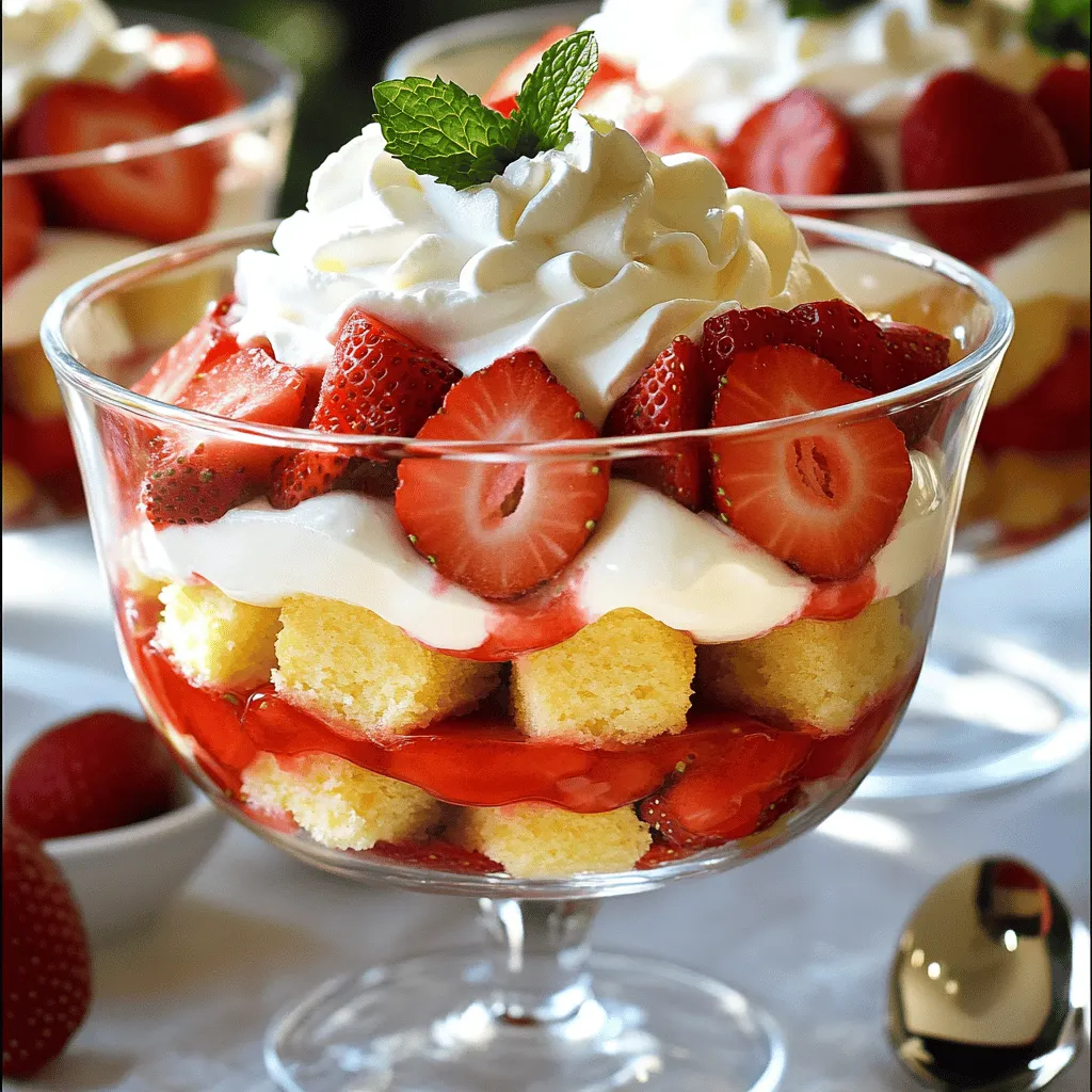 To make a tasty Strawberry Shortcake Trifle, you need fresh fruits. Here’s what to gather: - 2 cups fresh strawberries, hulled and sliced - 2 tablespoons sugar - 1 teaspoon vanilla extract These strawberries are the star of your trifle. The sugar helps bring out their sweet juice, making them even better. Next, you need some key baking and dairy items: - 1 sponge cake or angel food cake, cubed (store-bought or homemade) - 1 cup vanilla pudding (store-bought or homemade) - 1 cup heavy whipping cream - 1 tablespoon powdered sugar - 1 teaspoon almond extract The sponge cake gives your trifle a soft base. The vanilla pudding adds creaminess, while the whipped cream makes it light and fluffy. Finally, to make your trifle look great, consider these garnishes: - Fresh mint leaves for garnish - Additional strawberry slices for topping These bright colors make your trifle pop. Plus, mint adds a nice touch of freshness. Serve it in clear glass bowls to show off those beautiful layers! Start by hulling and slicing 2 cups of fresh strawberries. Place them in a medium bowl. Add 2 tablespoons of sugar. Toss well to coat the strawberries. Let them sit for about 15 minutes. This step helps the strawberries release their juices. You’ll notice their color deepening as they sit. It makes for a sweeter and juicier layer in your trifle. In another bowl, pour in 1 cup of heavy whipping cream. Use an electric mixer on medium speed. Whip until it starts to thicken. Then, add 1 tablespoon of powdered sugar and 1 teaspoon of almond extract. Continue to whip until soft peaks form. This process gives your cream a light and fluffy texture. It adds a rich taste to your trifle. Set the whipped cream aside for later. Grab a trifle dish or individual serving glasses. Start with a layer of cubed sponge cake at the bottom. You can use store-bought or homemade cake. Next, scoop some vanilla pudding over the cake layer. Spread it evenly so each bite has flavor. Now, add a layer of the macerated strawberries. Spoon some of their juice over the layer for extra taste. Top this with a smooth layer of whipped cream. Repeat the layering process: cake, pudding, strawberries, and whipped cream. Keep going until you fill the dish. Finish with a layer of whipped cream on top. For a bright finish, garnish with fresh strawberry slices and mint leaves. Chill the trifle in the refrigerator for at least 1 hour. This waiting time helps the flavors meld together beautifully. To make your Strawberry Shortcake Trifle burst with flavor, use fresh strawberries. They give the best taste when they're in season. Toss them in sugar and let them sit. This step makes the strawberries juicy and sweet. For extra flavor, add vanilla extract to your cream. It enhances the taste and aroma. Almond extract in the cream adds a pleasant twist. It gives your trifle a unique flavor that everyone will love. One common mistake is not letting the strawberries sit long enough. If you skip this step, they won't release their juices. This can make your trifle dry. Another mistake is over-whipping the cream. Stop whipping when you see soft peaks. Over-whipped cream can become grainy and lose its smoothness. Lastly, don’t rush the chilling process. Chilling for at least one hour helps flavors blend together. To make your trifle look stunning, use clear glass bowls or cups. This way, you can see all the lovely layers. After layering, drizzle some of the strawberry juice around the plate. It adds a nice touch and color. Garnish with extra strawberry slices and fresh mint leaves. This not only looks pretty but also adds freshness. Consider using a small spoon for serving to keep portions neat. {{image_2}} You can change the flavor of the pudding in your trifle. Try chocolate pudding for a richer taste. You can also use lemon pudding for a bright, zesty twist. Vanilla is classic, but feel free to explore. Each flavor adds a new layer of delight. If you need a gluten-free option, use gluten-free cake or angel food cake. Many stores sell gluten-free sponge cakes. You can also make your own with gluten-free flour blends. This way, you can enjoy the trifle without worry. Get creative with your trifle! Add layers of crushed cookies for crunch. Try using raspberries or blueberries instead of strawberries for a different flavor. You can mix in yogurt instead of pudding for a lighter option. The possibilities are endless, so have fun with it! To keep your Strawberry Shortcake Trifle fresh, cover it tightly with plastic wrap. You can also use a lid if your dish has one. Store it in the fridge. This helps keep the layers from drying out. Avoid pressing down on the trifle when covering it. You want to keep the pretty layers intact for the next serving. You can keep your trifle in the fridge for up to three days. After that, the cake may get soggy. The strawberries may start to lose their firmness too. If you have leftovers, try to eat them within this timeline for the best taste. If you freeze your trifle, you will need to reassemble it. First, take it out of the freezer and let it thaw in the fridge overnight. Once it is soft, the cake may need some extra moisture. You can brush it lightly with some strawberry juice. Then, add fresh whipped cream and strawberries before serving. This will help it look fresh and tasty again! Yes, you can make this trifle a day ahead. Just layer it as usual and chill it. This helps the flavors mix well. The longer it sits, the better it tastes. Just remember to add fresh mint and strawberry slices before serving. This keeps it looking bright and fresh. If you don’t have heavy cream, you can use coconut cream. It whips well and adds a nice flavor. You can also try whole milk with a bit of melted butter. For a lighter option, use whipped topping. It won't be as rich, but it will still taste good. Making your own vanilla pudding is easy. Start with 2 cups of milk. In a pot, heat the milk gently. In a bowl, mix 1/2 cup of sugar, 1/4 cup of cornsta