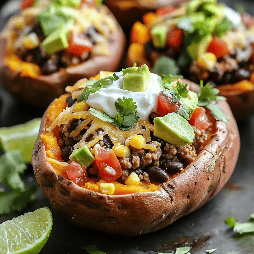 - 4 medium sweet potatoes - 1 lb ground turkey or beef - 1 can black beans, rinsed and drained - 1 cup corn kernels (fresh or frozen) - 1 packet taco seasoning - 1 cup diced tomatoes (fresh or canned) - 1 cup shredded cheese (cheddar or Mexican blend) - 1 avocado, diced - 1/2 cup Greek yogurt or sour cream - Fresh cilantro, chopped (for garnish) - Lime wedges (for serving) Sweet potatoes are the star here. They add sweetness and nutrients. Choose medium-sized ones for even cooking. Ground turkey is lean and healthy, but you can use beef for a richer flavor. Black beans add protein and fiber. Using fresh corn makes the dish taste bright. Canned tomatoes are a great shortcut. Use your favorite cheese for a melty topping. Finally, fresh cilantro brings a pop of flavor. You can swap the ground turkey for chicken or even plant-based meat. If you want a vegetarian take, try lentils or mushrooms. For the cheese, vegan cheese works well too. Instead of Greek yogurt, you can use a dairy-free sour cream. If you don't like cilantro, try green onions or parsley instead. Sweet potatoes can be swapped for regular potatoes, but they will change the taste. Start by preheating your oven to 400°F (200°C). This heat is perfect for baking sweet potatoes. Next, wash the sweet potatoes well. Use a fork to pierce them several times. This allows steam to escape while they bake. Place the sweet potatoes on a baking sheet. Bake them for 45 to 60 minutes. You will know they are ready when they feel soft. While the sweet potatoes bake, prepare the taco filling. In a skillet, heat it over medium heat. Add 1 pound of ground turkey or beef to the pan. Cook the meat for about 5 to 7 minutes until it is brown. Then, add the taco seasoning, black beans, corn, and diced tomatoes. Stir everything together well. Cook for another 5 minutes to heat it all through. When the sweet potatoes are done, take them out of the oven. Let them cool for a few minutes to avoid burns. Carefully cut each sweet potato in half lengthwise. Scoop out a small amount of flesh to make room for your filling. Now, fill each half with the taco meat mixture. Don't forget to sprinkle shredded cheese on top! Return the stuffed sweet potatoes to the oven for 10 more minutes. This melts the cheese and makes it bubbly. Once the time is up, take them out of the oven. Top each potato with diced avocado and a dollop of Greek yogurt or sour cream. Finish with freshly chopped cilantro. Serve with lime wedges on the side for a bright burst of flavor! To cook sweet potatoes perfectly, start by selecting ones that feel firm. Medium-sized sweet potatoes work best. Wash them well and pierce them with a fork. This step lets steam escape while baking. Bake at 400°F (200°C) for 45 to 60 minutes. You know they are ready when they feel soft. Let them cool before cutting. This makes it easier to scoop out the flesh. For a tasty taco filling, use fresh ingredients. Cook the ground turkey or beef until brown. This gives it a nice flavor. When you add the taco seasoning, stir it well with the meat. This helps the spices spread evenly. Add rinsed black beans and corn for texture. Diced tomatoes add moisture and freshness. Let it simmer for five minutes to blend all the tastes together. Serving is all about making your dish look inviting. After filling the sweet potatoes, sprinkle cheese on top. Bake them until the cheese melts. This gives a nice golden color. Top each potato with fresh avocado and a scoop of Greek yogurt or sour cream. Finish with chopped cilantro for a pop of color. Serve lime wedges on the side. This adds a zesty touch and makes your dish look stunning. {{image_2}} You can easily make Taco Stuffed Sweet Potatoes vegetarian or vegan. Instead of meat, use black beans or lentils. They add protein and fiber. You can also add more veggies like bell peppers or zucchini. For vegan cheese, look for plant-based options in stores. Replace Greek yogurt with a vegan yogurt. These swaps keep the dish tasty and filling. If you love heat, add spice to your taco filling. Use spicy taco seasoning or add chopped jalapeños. You can also mix in diced chipotle peppers in adobo sauce. For extra flavor, sprinkle cayenne pepper or chili powder. Top with spicy salsa for a fresh kick. These small changes will make your stuffed sweet potatoes fiery and delicious. Feel free to switch up the protein in your taco filling. Ground chicken or pork works great in this dish. You can also try plant-based meats like soy crumbles or tempeh. For a seafood twist, consider shrimp or fish. Each option has its own flavor, making this dish versatile. Just remember to cook the protein until it’s fully done before adding the other ingredients. To store leftover taco stuffed sweet potatoes, let them cool first. Place them in an airtight container. You can keep them in the fridge for up to 3 days. If you want them to last longer, consider freezing them. Make sure they are tightly wrapped to avoid freezer burn. When you’re ready to eat the leftovers, reheating is simple. Preheat your oven to 350°F (175°C). Place the stuffed sweet potatoes on a baking sheet. Heat them for about 15-20 minutes. You can also use a microwave if you’re in a hurry. Heat them on high for 1-2 minutes, checking to ensure they are warm throughout. Freezing taco stuffed sweet potatoes is a great option for meal prep. Wrap each half in plastic wrap, then place them in a freezer bag. Label the bag with the date. They can stay frozen for up to 3 months. When you want to eat them, thaw them in the fridge overnight before reheating. This method helps keep the flavors fresh and tasty. Yes, you can prepare Taco Stuffed Sweet Potatoes ahead of time. You can bake the sweet potatoes and cook the taco filling in advance. Store the sweet potatoes and filling separately in the fridge. When you're ready to eat, just reheat them. This way, you save time on busy days. You can use several options instead of ground turkey or beef. Conside