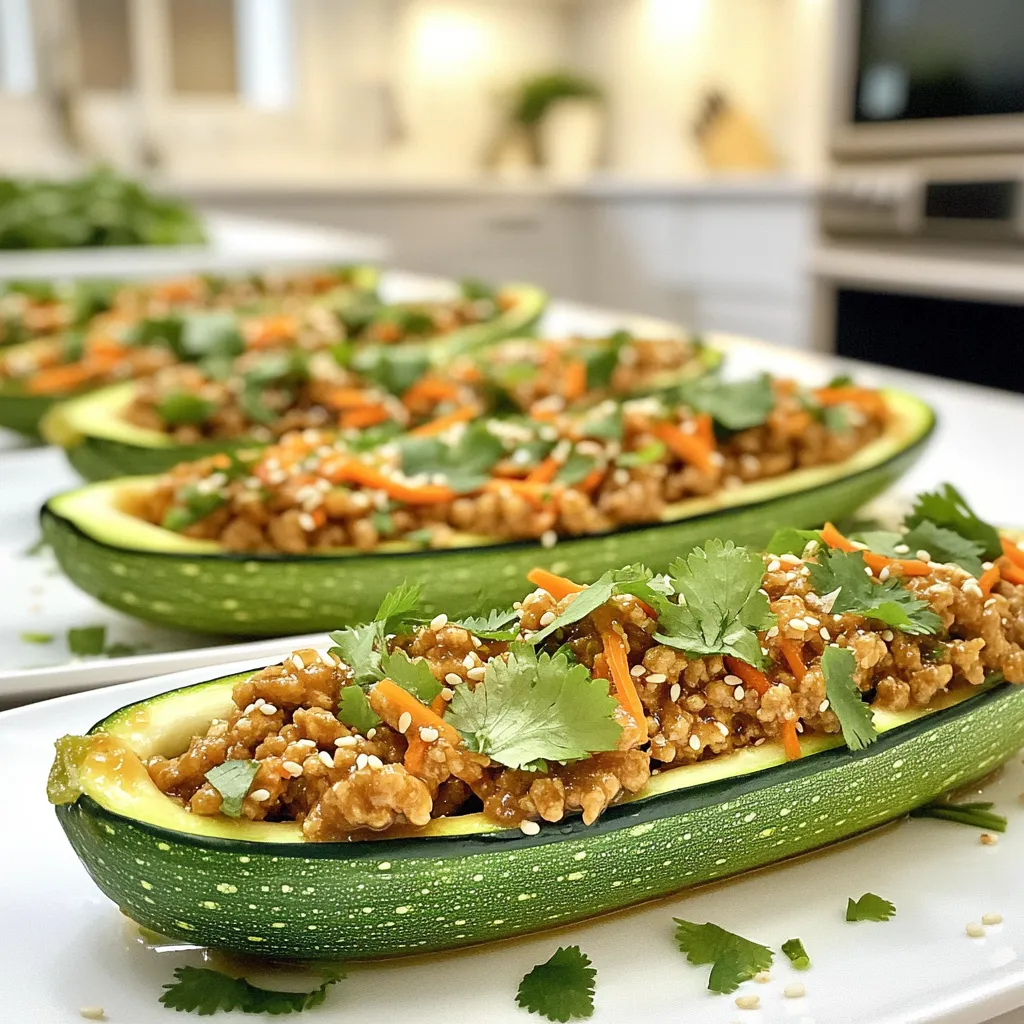 For the chicken filling, use fresh ground chicken. Fresh meat has a better taste. Cook it on medium heat. This keeps the chicken juicy. Add garlic and ginger first. These give the filling a great flavor. Stir in teriyaki sauce next. This sauce adds sweetness and tang. Mix in chopped green onions and carrots last. These add crunch and color. Make sure to pack the filling into the zucchini well. This ensures every bite is flavorful.