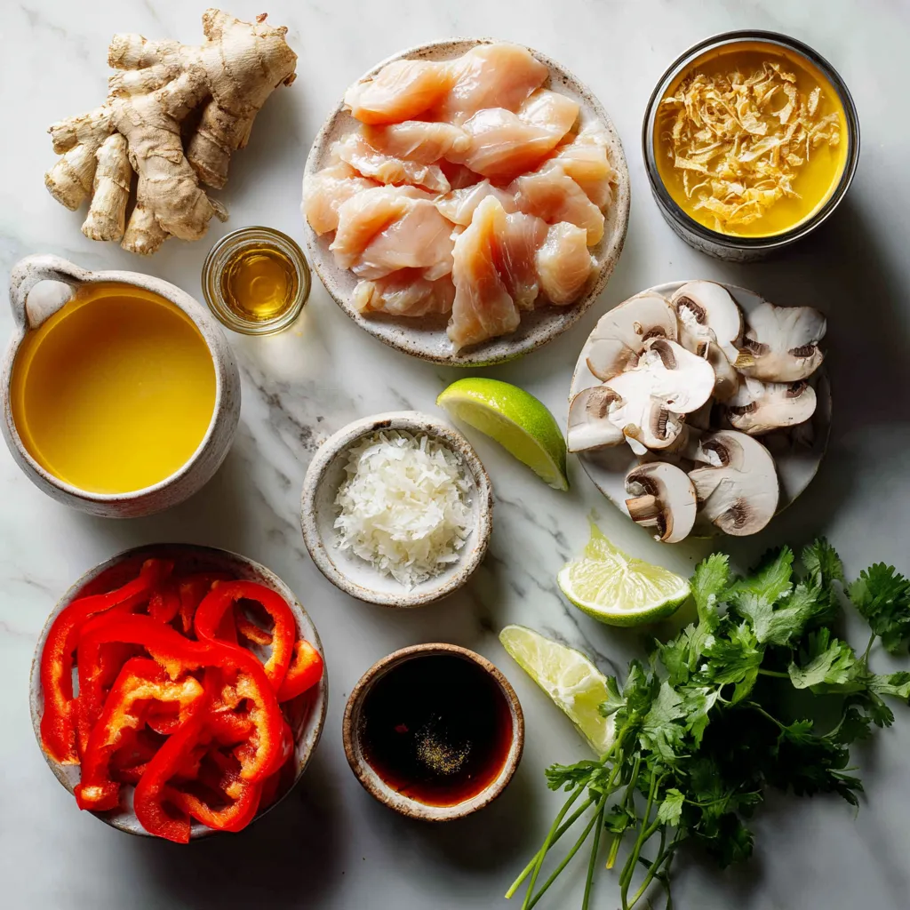 Start by gathering your ingredients. For this soup, you will need chicken breast, ginger, garlic, lemon grass, red bell pepper, and mushrooms. Slice the chicken into thin pieces. This helps it cook fast and stay tender. Grate the ginger and mince the garlic. Bruise the lemon grass to release its oils. Slice the red bell pepper and mushrooms. Keep everything ready before you start cooking.