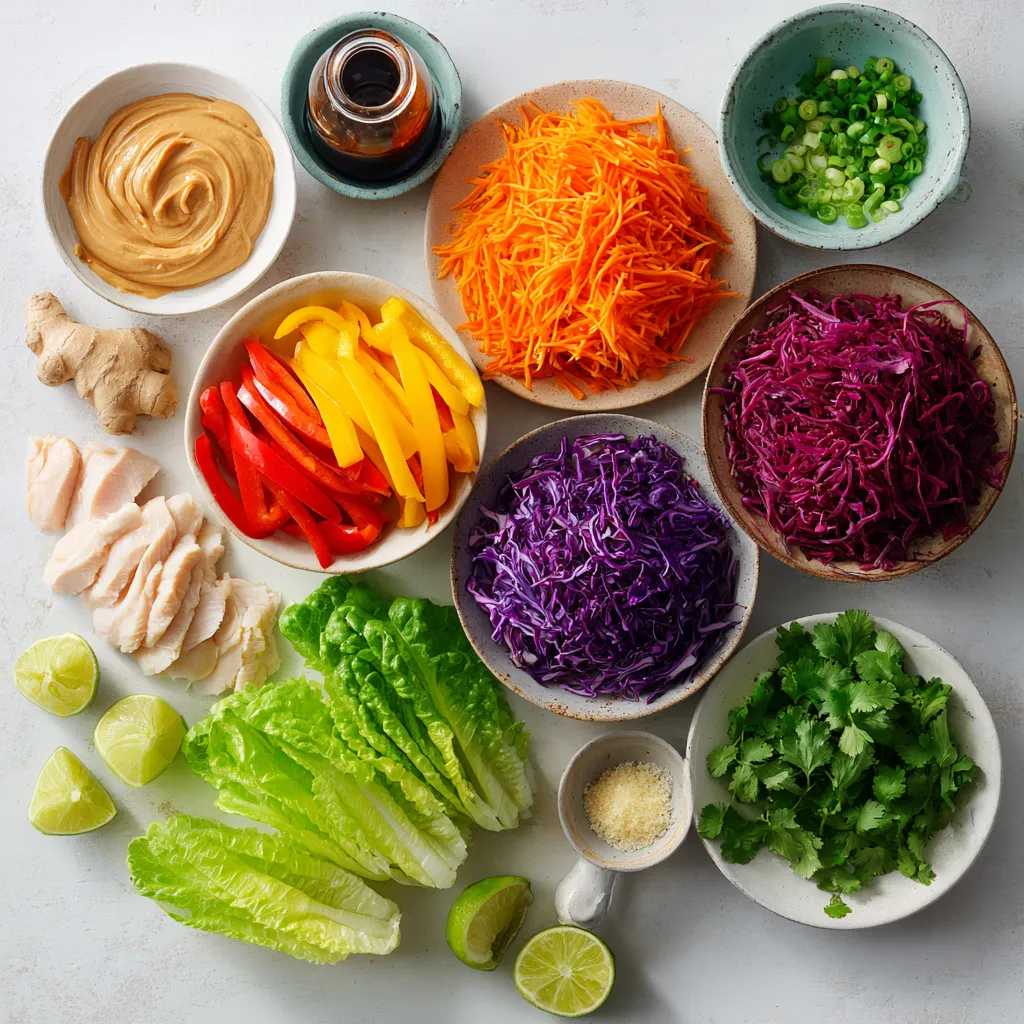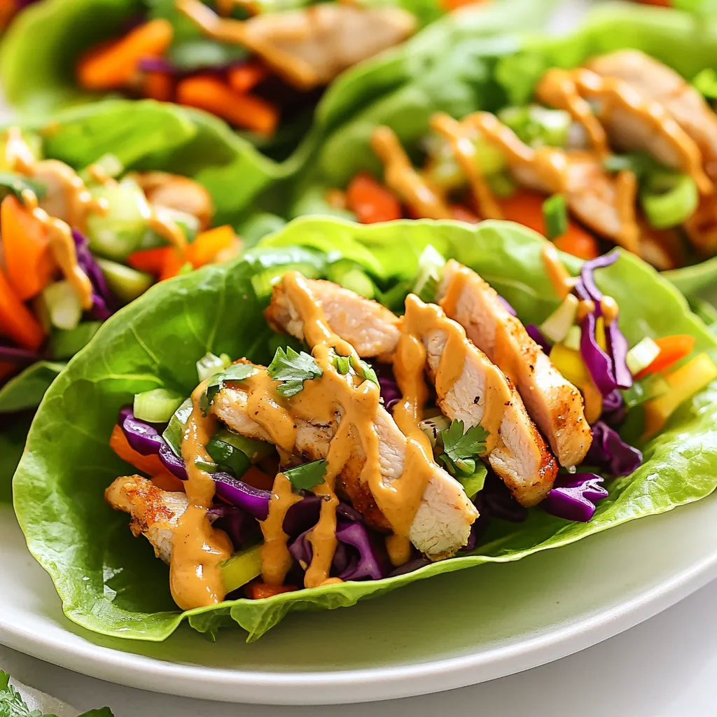 - 2 boneless, skinless chicken breasts - 1 tablespoon olive oil - Salt and pepper to taste - 1 bell pepper (red or yellow), thinly sliced - 1 cup shredded carrots - 1 cup red cabbage, shredded - ½ cup fresh cilantro, chopped - ¼ cup green onions, sliced - 4 large lettuce leaves (such as butter or romaine) For the Peanut Sauce: - ½ cup creamy peanut butter - 2 tablespoons soy sauce (or tamari for gluten-free) - 1 tablespoon honey or maple syrup - 1 tablespoon lime juice - 1 teaspoon grated fresh ginger - 1 teaspoon minced garlic - Water to thin (as needed) - Chicken Alternatives: You can use tofu or shrimp for different tastes. Both options work well in this recipe. - Vegetable Variations: Feel free to swap bell peppers with cucumbers or snap peas for crunch. You can also add avocado for creaminess. - Peanut Sauce Substitutions: If you can't find peanut butter, try almond or sunflower seed butter. These will give you a similar taste. You can also use a different sweetener like agave syrup. {{ingredient_image_1}} Start by seasoning the chicken breasts. Use olive oil, salt, and pepper. This simple mix boosts flavor. Heat your grill or pan over medium heat. Place the chicken on the grill or in the pan. Cook for 6-7 minutes on each side. The chicken needs to be fully cooked. It should reach 165°F inside. When done, let it cool for a moment. Then, shred or slice the chicken. Grab a bowl for the peanut sauce. Add creamy peanut butter, soy sauce, honey, lime juice, grated ginger, and minced garlic. Whisk them together until smooth. If the sauce is too thick, add water a little at a time. This helps to reach your desired consistency. Taste it and adjust if needed. You can add more honey for sweetness or more lime for tang. Now, let's build those wraps! Start with a large lettuce leaf on a plate. Place a few slices of grilled chicken in the center. Add bell pepper, shredded carrots, red cabbage, cilantro, and green onions. Drizzle a generous amount of peanut sauce on top. Next, fold the sides of the lettuce leaf over the filling. Then, roll it up from the bottom. If needed, use a toothpick to hold it together. Repeat this with the rest of your ingredients. Serve immediately with extra peanut sauce for dipping. Enjoy your tasty Thai peanut chicken wraps! Cooking Time Recommendations Cook chicken breasts for 6-7 minutes on each side. Use medium heat for even cooking. The chicken is done when it reaches 165°F. A meat thermometer helps with precision. Ensuring Juiciness To keep chicken juicy, let it rest before shredding. This process helps the juices stay inside. Season with salt and pepper before cooking for added flavor. Flavor Boosters Add a splash of lime juice for brightness. A bit of honey or maple syrup enhances sweetness. Fresh ginger and garlic add depth. Don’t skip these key ingredients! Common Mistakes to Avoid Avoid over-mixing the sauce; it can become too thick. If it’s thick, add water a little at a time. Taste as you go to adjust flavors. Plating Ideas Use a large plate for wraps. Arrange them neatly in a line or a circle. This makes the dish look inviting and fun. Garnishing Suggestions Sprinkle chopped cilantro on top for color. Add slices of lime next to the wraps for extra zing. A drizzle of extra peanut sauce can make it pop! Pro Tips Marinate the Chicken: For extra flavor, marinate the chicken in the peanut sauce for at least 30 minutes before cooking. This enhances the taste and tenderness of the meat. Customize Your Veggies: Feel free to mix and match vegetables according to your preference. Try adding cucumber, zucchini, or even avocado for added creaminess and crunch! Make it Spicy: If you like a kick, add some sliced jalapeños or a drizzle of sriracha to your wraps for an extra layer of heat and flavor. Store Leftover Sauce: The peanut sauce can be stored in the refrigerator for up to a week. Use it as a dip for fresh veggies or drizzle it over salads for a quick meal! {{image_2}} You can change the peanut sauce to suit your taste. - Spicy Peanut Sauce: To make it spicy, add red pepper flakes or sriracha. This gives the sauce a warm kick. Start with a small amount, then taste and add more if you like it hotter. - Alternative Dressings: You can try other dressings too. A sesame ginger dressing is a great option. It adds nice flavor and pairs well with the chicken. You can use different greens or add more fillings to your wraps. - Using Different Leafy Greens: Try using collard greens or Swiss chard instead of lettuce. These greens are sturdy and work well for wraps. They also add a unique taste. - Adding Different Fillings: Mix in other veggies like cucumber or avocado. You can also add cooked shrimp or tofu for a fun twist. Experimenting keeps your wraps exciting and fresh. Make these wraps fit your diet with a few easy changes. - Gluten-Free Options: Use tamari instead of soy sauce for a gluten-free peanut sauce. This keeps the flavors while making it safe for those with gluten allergies. - Vegetarian or Vegan Versions: Replace the chicken with tofu or tempeh. Marinate tofu to add flavor before cooking. Use maple syrup instead of honey to keep it vegan. These swaps keep the dish just as tasty! After you enjoy your Thai peanut chicken wraps, store the leftovers well. - Refrigeration Tips: Place the wraps in an airtight container. They stay fresh for up to three days in the fridge. This keeps the chicken and veggies crisp. If you store the sauce separately, it lasts longer, about one week. - Freezing Instructions: You can freeze the chicken and sauce, but not the wraps. Wrap the chicken tightly in plastic wrap, then place it in a freezer bag. For the sauce, pour it into a freezer-safe container. It’s best used within three months. When reheating, you want to keep the chicken juicy. - Best Methods to Reheat Chicken: The oven works best. Preheat to 350°F (175°C). Place the chicken in a dish and cover with foil. Heat for about 15 minutes. You can also use a skillet
