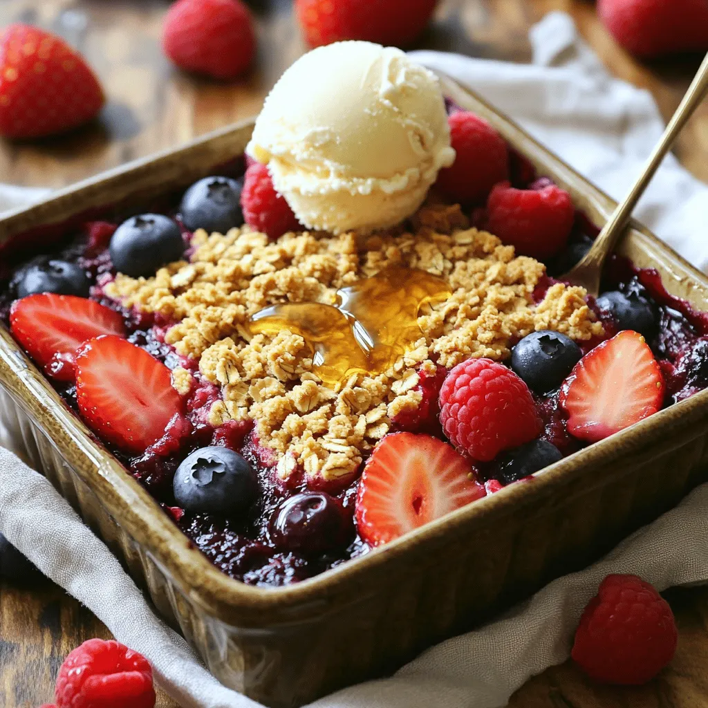 2. In a large mixing bowl, combine the strawberries, blueberries, and raspberries. Drizzle the honey or maple syrup and vanilla extract over the berries. Gently toss to coat. Pour the berry mixture into a greased 8×8 inch baking dish.
