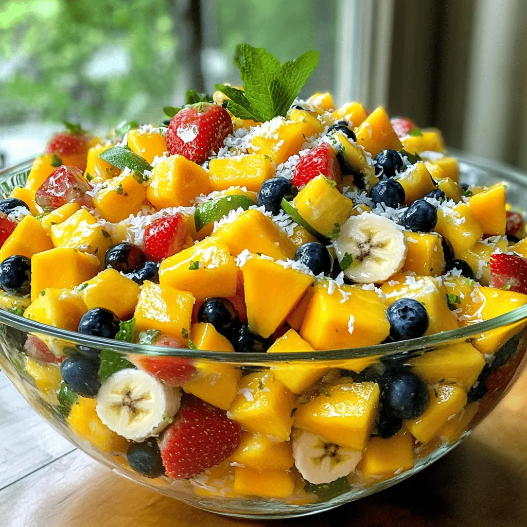 ![For a vibrant tropical fruit salad, use these fresh fruits: - 1 ripe mango, peeled and diced - 1 pineapple, peeled, cored, and diced - 1 papaya, peeled and diced - 1 cup strawberries, hulled and halved - 1 cup blueberries - 1 banana, sliced These fruits bring a range of colors and flavors. The mango adds sweetness, while the pineapple brings a delicious tartness. Papaya offers a soft texture that complements the crunch of strawberries and blueberries. Bananas add creaminess, tying the salad together. You can enhance your salad with some fun add-ins: - 1/2 cup shredded coconut (unsweetened) - Fresh mint leaves for garnish Adding shredded coconut gives a chewy texture and tropical feel. Fresh mint leaves not only look pretty but also add a refreshing aroma. You can also try adding nuts for crunch or seeds for extra nutrition. For a simple dressing, you need: - 1 lime, juiced - 2 tablespoons honey (or agave syrup) This dressing is light and bright. The lime juice adds a zesty kick, balancing the sweetness of the fruits. Honey or agave syrup brings a touch of sweetness, enhancing the fruits’ natural flavors. Make sure to mix the lime juice and honey well. This will ensure every bite is packed with flavor. Want the full recipe? Check out the Full Recipe for all steps. First, gather all your fruits. You need a ripe mango, pineapple, papaya, strawberries, blueberries, and a banana. Peel and dice the mango, pineapple, and papaya. Make sure to slice the banana. Hull and halve the strawberries, and rinse the blueberries. This keeps them fresh and clean. Next, take a large mixing bowl. Add all your diced fruits: mango, pineapple, papaya, strawberries, blueberries, and banana. In a small bowl, mix the lime juice and honey. Stir until well mixed. If you want it sweeter, add more honey. Pour this mixture over the fruit. Gently toss everything together until all the fruit is coated. Finally, sprinkle shredded coconut on top. Let your salad sit for about 10 minutes. This helps all the flavors blend. Serve it in a big glass bowl for a beautiful display. For a fun touch, add a lime slice on the edge of each bowl. You can find the full recipe [here]. Enjoy your fresh tropical fruit salad! To make the best tropical fruit salad, pick your fruits wisely. Look for mangoes that have a slight give when you press them. They should smell sweet near the stem. Choose pineapples that feel heavy for their size and have a sweet scent. Papayas should be mostly yellow and slightly soft. Strawberries should be bright red with green tops, while blueberries should be plump and firm. Bananas should have a few brown spots, showing ripeness. To boost the flavor, add a splash of lime juice. It adds a nice tang. You can also mix in a bit of honey for sweetness. If you like crunch, try adding nuts like almonds or cashews. Chopped mint leaves give a fresh taste. You could also include a sprinkle of chili powder for some heat. These touches make the fruit salad even more exciting. Presentation matters when serving fruit salad. Use a large glass bowl to show off the colors. Layer the fruits for a striking look. You can add a slice of lime on the edge of each bowl. Fresh mint leaves make a great garnish, adding color and aroma. For a fun twist, serve in individual cups. This makes it easy for guests to grab their own. These tips will help your tropical fruit salad shine at any gathering. For the complete recipe, check out the Tropical Paradise Fruit Salad. {{image_2}} Adding citrus fruits brings a bright twist. You can use oranges, limes, or grapefruits. Their juice adds a zesty taste. I love using oranges for sweetness. Just peel and segment them. Mix these citrus pieces with your tropical fruits. It adds flavor and makes your salad juicy. Want extra texture? Try adding nuts or seeds. Chopped almonds or walnuts work great. Sunflower seeds add a unique crunch, too. Just sprinkle a handful over the top. This makes each bite more exciting. Plus, it gives you healthy fats and proteins. You can make your salad suit your diet. For a vegan dressing, skip honey. Use agave syrup or maple syrup instead. If you want a sugar-free option, try lime juice alone. It’s tangy and refreshing. Mix it with fresh herbs like mint for added flavor. These options keep your salad fresh and tasty. For the complete recipe, check out the Full Recipe section. If you have leftover tropical fruit salad, store it in an airtight container. Keep it in the fridge. This helps keep the fruit fresh for about two days. Avoid adding the dressing until you're ready to eat it. This keeps the fruit crunchy and tasty. To keep your fruit salad fresh, follow these tips: - Wash and dry fruit before cutting. - Cut fruit just before mixing for the best taste. - Use fresh fruits that are ripe but firm. - Keep leftover salad cool to prevent spoilage. - Use lime juice to help slow browning on fruits like bananas and apples. You can freeze tropical fruits for later use. Here’s how: 1. Peel and chop the fruit as needed. 2. Lay the pieces flat on a baking sheet. 3. Freeze them for about two hours. 4. Once frozen, transfer the fruit into a zip-top bag. 5. Label the bag with the date and type of fruit. You can use frozen fruits in smoothies or as toppings. Enjoy the tropical taste all year long! You can use many fruits in your tropical fruit salad. Here are some great choices: - Mango - Pineapple - Papaya - Strawberries - Blueberries - Bananas - Shredded coconut You can also try other fruits like kiwi, passion fruit, or dragon fruit. The key is to pick ripe, fresh fruits. Mix different colors and textures for a beautiful salad. Yes, you can prepare the salad ahead of time. However, fresh fruit tastes best. If you want to make it in advance, do this: - Cut the fruits and store them in an airtight container. - Add the dressing just before serving. This keeps the fruits from getting mushy. You can make it a few hours ahead and still enjoy its freshness. A simple lime and honey dressin