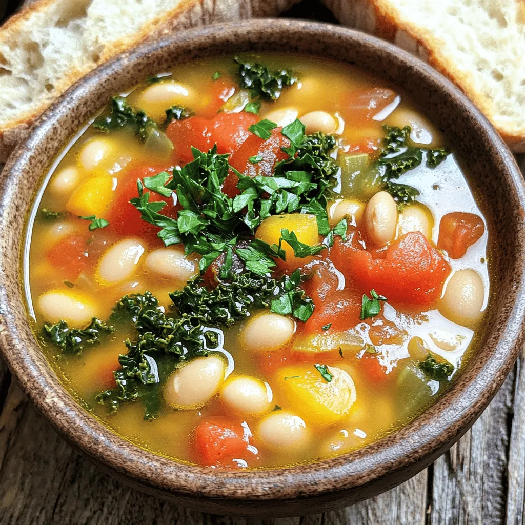 ![- 1 can (15 oz) of cannellini beans, drained and rinsed - 1 can (15 oz) of diced tomatoes, undrained - 4 cups vegetable broth - 2 cups fresh kale, chopped - 1 medium onion, chopped - 2 cloves garlic, minced - 2 large carrots, diced - 2 celery stalks, diced - 1 teaspoon dried rosemary - 1 teaspoon dried thyme - 1 bay leaf - Salt and black pepper to taste When I make Tuscan White Bean Soup, I enjoy using simple, fresh ingredients. The cannellini beans are creamy and rich. They provide protein and fiber. The diced tomatoes add sweetness and acidity, balancing the flavors. Vegetable broth gives depth to the soup, making it warm and hearty. I love adding kale for a pop of green and nutrients. The aromatics—onion, garlic, carrots, and celery—bring life to the soup. They create a lovely base and fill your kitchen with amazing scents. The herbs, like rosemary and thyme, add a touch of earthiness and warmth. This soup is not just a meal; it is a hug in a bowl. Each ingredient plays a role in crafting a comforting dish. You can find the full recipe in the section above, detailing how to combine these delightful ingredients into a flavorful soup. First, you need to heat olive oil in a large pot over medium heat. Once that’s ready, add the chopped onions. Sauté them for about 3-4 minutes. You want them to become soft and translucent. Next, toss in the minced garlic, diced carrots, and diced celery. Cook this mix for another 5 minutes, stirring often. This step helps the flavors blend and makes your kitchen smell amazing. Once your vegetables are soft, it’s time to add the dried herbs. Stir in the dried rosemary, dried thyme, and bay leaf. Let these herbs cook for about 1 minute. This little step helps release their rich flavors. Now, pour in the vegetable broth and add the rinsed cannellini beans along with the undrained diced tomatoes. Bring everything to a gentle boil. After it reaches a boil, lower the heat to let it simmer. Allow it to cook for 15-20 minutes. This time helps all the ingredients meld together beautifully. When the time is up, remove the bay leaf and stir in the fresh chopped kale. Cook for an additional 5 minutes until the kale wilts and softens. This adds a fresh touch to your soup. Season it with salt and black pepper to taste. For a complete guide, check the [Full Recipe]. To make your Tuscan White Bean Soup shine, use fresh herbs. Fresh parsley, rosemary, or thyme adds a bright flavor. Chop them finely and stir them in at the end. This keeps their taste strong. Simmering is key for great flavor. After you mix in the broth, let the soup cook slowly. This melds the flavors together. Aim for about 15-20 minutes. You will notice the difference in taste. When serving, make it look nice. Ladle the soup into bowls. Sprinkle fresh parsley on top. Then, drizzle a bit of olive oil. This adds a touch of color and flavor. Pair your soup with crusty bread. A thick slice of sourdough or whole grain works best. You can even dip it into the soup for extra enjoyment. White beans are packed with nutrients. They provide protein, fiber, and iron. Adding kale boosts the soup's vitamins A and C. This makes the soup not just tasty but healthy. Using vegetable broth is smart too. It keeps the soup light and flavorful. Plus, it adds more nutrients without extra fat. This makes your soup a nourishing choice. {{image_2}} You can easily switch up the beans in this soup. Try using great northern or navy beans. These beans add a nice texture and flavor. You can also add proteins like shredded chicken or sausage for more heartiness. For greens, feel free to swap kale for spinach or Swiss chard. Both options give a fresh taste and extra nutrients. You can even add veggies like zucchini or bell peppers for added color and crunch. To kick up the flavor, sprinkle in some spices. A dash of paprika adds warmth, while cayenne gives it a nice kick. If you like cheesy flavors, try adding grated parmesan or nutritional yeast. Both add creaminess and depth to the soup. You can also toss in a splash of lemon juice for brightness. This little touch can elevate the taste of your soup. If you want a different texture, blend the soup until smooth for a creamy puree. This style is great for a fancy dinner. You can also use this soup as a base for many meals. Serve it with rice or pasta for a filling dish. You can also pour it over grilled chicken or fish for a delicious twist. Use this soup as a canvas, and let your imagination run wild! For the full recipe, check out the complete instructions. To store your leftover Tuscan White Bean Soup, let it cool first. Use an airtight container for the best results. The soup stays fresh in the fridge for about 3 to 4 days. Make sure to label it with the date you made it. This helps you keep track of how long it has been stored. If you want to freeze the soup, start by letting it cool. Then, pour it into freezer-safe containers or bags. Leave some space at the top for expansion. You can freeze the soup for up to 3 months. When you are ready to eat, thaw it overnight in the fridge. For reheating, you can use either the stovetop or microwave. If you use the stovetop, warm it over medium heat. Stir it often to keep it from sticking. For the microwave, heat in short bursts. Stir in between to ensure even heating. To keep the flavor and texture, add a splash of broth or water if it seems too thick. Enjoy your soup as if it was just made! How long does Tuscan White Bean Soup last in the fridge? Tuscan White Bean Soup lasts about 4 to 5 days in the fridge. Store it in an airtight container. This helps keep the soup fresh and tasty. Can I make this soup ahead of time? Yes, you can make this soup ahead. It actually tastes better after sitting for a day. Just let it cool and store it in the fridge. Is it possible to make this soup vegan? Absolutely! This soup is already vegan. Just use vegetable broth and skip any meat. You can enjoy its rich flavors without any animal products. Can