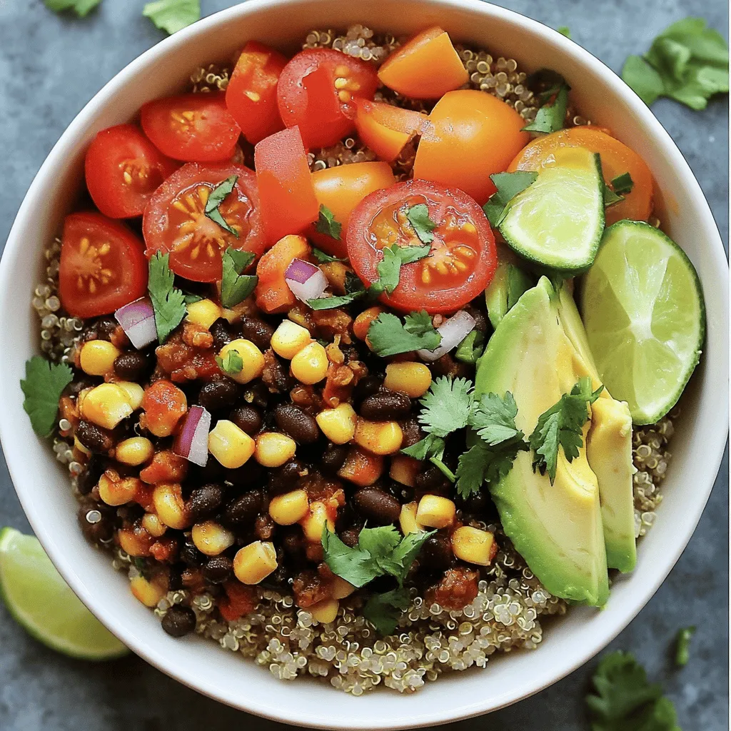 To make a tasty vegan burrito bowl, you need some key ingredients. Here’s what you’ll need: - 1 cup quinoa, rinsed - 2 cups vegetable broth - 1 can (15 oz) black beans, rinsed and drained - 1 cup corn kernels (frozen or fresh) - 1 red bell pepper, diced - 1 avocado, sliced - 1 cup cherry tomatoes, halved - 1 small red onion, finely chopped - 1 teaspoon ground cumin - 1 teaspoon chili powder - 1 tablespoon olive oil - Juice of 1 lime - Salt and pepper to taste - Fresh cilantro, for garnish These ingredients create a wonderful mix of flavors and textures. Using fresh ingredients gives your vegan burrito bowl a bright taste. Fresh corn and bell peppers add crunch and flavor. However, frozen ingredients are great too! They are often just as nutritious and can save time. If you choose frozen corn, it cooks quickly and still tastes great. Add some fun toppings to make your bowl even better. Here are some ideas: - Sliced jalapeños for heat - Vegan sour cream for creaminess - Sliced radishes for crunch - Chopped green onions for freshness These extras can make your meal more exciting and personal. Feel free to mix and match! For the full recipe, check out the Vibrant Vegan Burrito Bowl . Enjoy cooking! First, we need to cook the quinoa. In a medium pot, add 1 cup of rinsed quinoa and 2 cups of vegetable broth. Turn the heat up high and bring it to a boil. Once boiling, lower the heat, cover the pot, and let it simmer for 15 minutes. When the quinoa is fluffy and the broth is gone, take it off the heat. Let it sit for 5 minutes. After that, fluff it gently with a fork. While the quinoa cooks, I like to prepare the black bean mix. Heat 1 tablespoon of olive oil in a skillet over medium heat. Add 1 small chopped red onion and sauté for about 3 minutes. You want it to look clear and soft. Next, add 1 can of rinsed black beans, 1 cup of corn, 1 teaspoon of ground cumin, 1 teaspoon of chili powder, and some salt and pepper. Stir everything well and cook for another 5 minutes until it's warm. Now, it’s time to build your burrito bowl! Start with a big scoop of fluffy quinoa at the bottom of each bowl. Then, layer on the warm black bean mix. Next, add diced red bell pepper, sliced avocado, and halved cherry tomatoes on top. To finish it off, squeeze fresh lime juice over everything for a zesty kick. Don't forget to sprinkle some chopped cilantro for a fresh touch. To make perfect quinoa, always rinse it first. Rinsing removes a bitter coating called saponin. Use a 2:1 ratio of liquid to quinoa for fluffy results. Stir the quinoa once while it cooks; this helps it cook evenly. After cooking, let it rest for a few minutes. This step makes it even fluffier! For more details, check the Full Recipe. It's packed with flavor and nutrition! When you make your burrito bowl, start with fresh ingredients. Look for ripe avocados and bright cherry tomatoes. Fresh herbs like cilantro add a great finish. You can use canned beans, but choose those without added sugars or salt. Frozen corn works well too, as it retains its flavor. Always rinse canned goods to remove excess sodium. Spices are your secret weapon. Ground cumin gives warmth and depth. Chili powder adds a nice kick. Feel free to add garlic powder or smoked paprika for extra flavor. Experiment with different spice blends to find what you love. Taste as you go, and adjust spices to suit your palate. Meal prepping saves time. Cook a big batch of quinoa at the start of the week. Store it in the fridge and use it for lunches and dinners. Chop veggies ahead of time and keep them ready to go. You can also prepare the black bean mixture in advance. Just reheat it when you’re ready to eat. This way, you’ll have a healthy meal ready in minutes. For more details, check the Full Recipe. {{image_2}} You can easily swap ingredients in your burrito bowl. If you're gluten-free, use quinoa or rice instead of wheat products. For nut allergies, skip avocado. Instead, try sunflower seeds for healthy fats. If you avoid legumes, use grilled veggies for extra flavor. These changes still keep your meal tasty and nutritious. The base of your bowl can vary. Quinoa is great, but brown rice works too. If you want a lighter option, use a bed of lettuce. For a fun twist, try cauliflower rice. Each base brings a different texture and flavor. Experiment to find your favorite! Toppings make your burrito bowl special. Try sliced jalapeños for spice or roasted sweet potatoes for sweetness. A dollop of salsa adds zest, while a sprinkle of nutritional yeast gives a cheesy flavor. Fresh herbs like cilantro or parsley can brighten your dish. Mix and match for endless variations! You can store leftover burrito bowls in the fridge. Use airtight containers to keep them fresh. They last for about three days. If you want to save space, keep the toppings separate. This way, your avocado and other veggies stay crisp. When reheating, use the microwave or a skillet. If you choose the microwave, cover the bowl with a damp paper towel. This keeps the food moist. Heat it for one to two minutes until warm. If using a skillet, add a splash of water and cover. Heat on medium until everything is hot. Meal prep makes busy days easier. Cook a big batch of quinoa and your black bean mix. Divide them into containers. Add fresh toppings when you are ready to eat. This keeps everything fresh and tasty. You can mix and match flavors all week long with the full recipe! A vegan burrito bowl is a hearty meal. It mixes grains, beans, veggies, and spices. You can enjoy it in a bowl, just like a burrito. This dish is colorful and full of flavor. It is perfect for lunch or dinner. The base is often quinoa or rice. You can top it with your favorite veggies, like corn and peppers. It is a filling meal that is also healthy. To make a vegan burrito bowl gluten-free, choose gluten-free grains. Quinoa is a great option. Always check labels on canned goods. Some sauces and seasonings may contain gluten. Use fresh spices