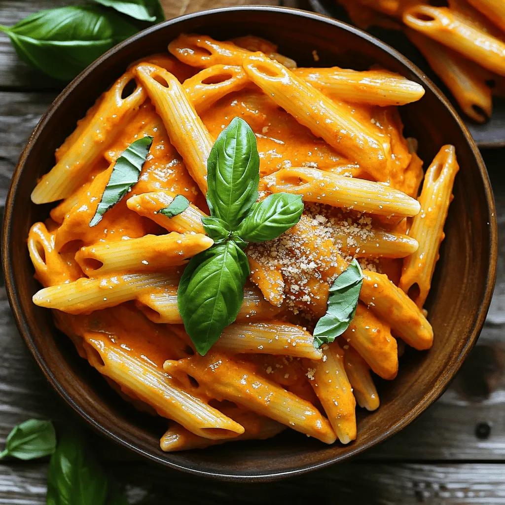 To make this Vegan Creamy Roasted Red Pepper Pasta, you need: - 12 oz (340g) pasta of choice (e.g., penne or fusilli) - 3 large red bell peppers - 1 medium onion, chopped - 3 cloves garlic, minced - 1 cup canned coconut milk - 1/4 cup nutritional yeast - 2 tablespoons olive oil - 1 teaspoon smoked paprika - Salt and pepper to taste - Fresh basil or parsley for garnish You can add more flavor with these ingredients: - A pinch of red pepper flakes for spice - A squeeze of lemon juice for brightness - Cherry tomatoes for a burst of sweetness - Vegan parmesan for extra creaminess When choosing your red bell peppers, look for these signs: - Bright color with no blemishes - Firm texture without soft spots - Heavy for their size, which means they are fresh For the onion and garlic, choose firm, dry bulbs. Store them in a cool, dry place. Fresh ingredients make all the difference in taste. Start by preheating your oven to 400°F (200°C). This helps the red peppers roast perfectly. Next, take three large red bell peppers and place them on a baking sheet. Roast the peppers in the oven for 25-30 minutes. You want the skins to be charred and blistered. Once they are done, remove them from the oven and let them cool. This cooling step is key. While your peppers cool, fill a large pot with water and add salt. Bring the water to a boil. Once boiling, add 12 oz (340g) of your chosen pasta, like penne or fusilli. Cook the pasta according to the package instructions until it is al dente. This means it should be firm to the bite. After cooking, drain the pasta and set it aside. Now, let’s make the sauce. In a skillet over medium heat, add two tablespoons of olive oil. Once the oil is hot, add one chopped medium onion. Sauté the onion for about five minutes until it becomes translucent. Then, add three minced garlic cloves and sauté for one more minute. Take the cooled roasted peppers, peel off the skins, and remove the seeds. Add them to the skillet. Now stir in one cup of canned coconut milk, a quarter cup of nutritional yeast, one teaspoon of smoked paprika, salt, and pepper to taste. Let this mixture simmer for about 5-7 minutes. This allows the flavors to blend beautifully. Once done, pour the mixture into a blender. Blend until it is smooth and creamy. If the sauce is too thick, add a little water or more coconut milk. Finally, pour the creamy sauce back into the skillet. Add the cooked pasta and toss everything together. Make sure the pasta is well coated with the sauce. Taste and adjust the seasoning if needed. Serve your pasta right away, garnished with fresh basil or parsley. Enjoy! To get that dreamy creamy texture, blend well. After cooking the roasted peppers and spices, use a good blender. Make sure to blend long enough to reach a smooth consistency. If your sauce is too thick, add a little water or more coconut milk. This will keep it creamy but not too runny. Want to kick up the flavor? Add fresh herbs like basil or parsley right before serving. You can also try squeezing in some lemon juice for a bright taste. A pinch of red pepper flakes can add a nice kick. Remember, taste your sauce before mixing it with pasta. Adjust the salt and pepper to your liking. Don’t skip roasting the peppers. This step adds a lot of flavor. Also, be careful not to overcook the pasta. You want it to be al dente so it holds up in the sauce. Lastly, when blending, don’t rush it. A smooth sauce makes a big difference in the final dish. {{image_2}} You can use any pasta you like for this dish. I often choose penne or fusilli. These shapes hold sauce well. You can also try whole wheat or gluten-free pasta. Each type brings its own taste and texture. Experiment to find your favorite! If you want more protein, add chickpeas or tofu. Chickpeas give a nice, nutty flavor. Just toss them in with the pasta. Cooked tofu adds creaminess and absorbs the sauce well. Use firm or extra-firm tofu for the best results. You can also sauté it with the onion for added taste. If you like spice, add red pepper flakes or jalapeños. You can sprinkle these in when cooking the onion and garlic. For a smoky flavor, try adding chipotle peppers. A squeeze of lemon juice can brighten the dish too. This mix of flavors makes it more exciting! To store leftover vegan creamy roasted red pepper pasta, let it cool first. Place it in an airtight container. Store it in the fridge for up to three days. Make sure to seal it well to keep the flavors fresh. When you're ready to eat, you can reheat the pasta. Place it in a skillet over medium heat. Add a splash of water or coconut milk to help it warm up. Stir often until it's hot. You can also use a microwave. Warm it in short bursts, stirring in between. This keeps it creamy and prevents it from drying out. If you want to save some for later, freezing works great. Allow the pasta to cool completely. Transfer it to a freezer-safe container. Be sure to leave some space at the top, as it will expand. You can freeze it for up to three months. To eat, thaw it overnight in the fridge before reheating. This way, it stays tasty and delicious! Yes, you can use other non-dairy milk. Almond milk, soy milk, or oat milk work well. Just remember, these milks may change the flavor a bit. Coconut milk gives a rich creaminess. Other milks might be lighter. If you want a thicker sauce, choose a creamier option. This pasta dish lasts about 3 to 5 days in the fridge. Store it in an airtight container. Make sure it cools down before you store it. If you want to keep it fresh longer, you can freeze it. Just thaw it in the fridge before reheating. You can make this recipe gluten-free with the right pasta. Look for gluten-free penne or fusilli. Many brands offer these options. Always check the label to be sure. This way, anyone can enjoy the creamy roasted red pepper pasta. This blog covered key ingredients for a tasty pasta dish. We explored how to prep, cook, and make the creamy sauce. You learned tips to perfect te