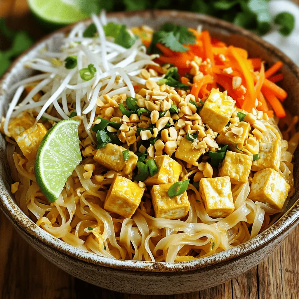 ![To create Vegan Pad Thai Noodles, you need some key ingredients. Here is what you will need: - 200g rice noodles - 2 tablespoons tamari (or soy sauce) - 1 tablespoon peanut butter - 1 tablespoon maple syrup - 2 tablespoons lime juice - 1 tablespoon sesame oil - 1 cup tofu, cubed - 2 cloves garlic, minced - 1 small red chili, thinly sliced (optional for heat) - 1 cup bean sprouts - 1 carrot, julienned - 1 bell pepper, thinly sliced - ¼ cup green onions, chopped - 2 tablespoons crushed peanuts (for garnish) - Fresh cilantro (for garnish) - Lime wedges (for serving) These ingredients give the dish its classic taste and texture. You can add optional ingredients for more flavor. Here are some ideas: - Sriracha or chili flakes for heat - Broccoli or snap peas for crunch - Fresh basil or mint for a herbaceous note - Sesame seeds for added texture Feel free to mix and match these extras to suit your taste. Vegan Pad Thai is not only tasty but also nutritious. Here’s a quick look at the nutritional benefits: - High in protein from tofu - Packed with vitamins from fresh vegetables - Healthy fats from peanut butter and sesame oil - Low in cholesterol since it's plant-based This dish can fit well into a balanced diet, making it a great choice for everyone. Enjoy the flavors and the health benefits of Vegan Pad Thai Noodles. For the full recipe, check the detailed instructions above. To start, boil water in a large pot. Add the rice noodles. Cook them according to the package instructions. You want them to be al dente. This means they should be soft but still have a slight bite. After cooking, drain them and rinse under cold water. This stops the cooking process and keeps them from sticking. Set the noodles aside while you prepare the sauce and other ingredients. In a bowl, whisk together the tamari, peanut butter, maple syrup, lime juice, and sesame oil. Keep whisking until the mixture is smooth. Taste it! You can adjust the flavors. If you want more tang, add more lime juice. If you prefer it sweeter, add a bit more maple syrup. This sauce gives the dish its rich flavor. Next, heat a non-stick skillet over medium-high heat. Add a little oil to the pan. Once hot, add the cubed tofu. Cook it until it is golden brown and crispy on all sides. This should take about 8 to 10 minutes. Once done, remove the tofu from the skillet and set it aside. In the same skillet, add the minced garlic and sliced chili. Sauté them for about 30 seconds until fragrant. Then, add the julienned carrots and sliced bell pepper. Stir and cook for about 3 to 5 minutes until they are slightly tender. Now it’s time to bring everything together! Add the cooked rice noodles and the prepared sauce to the skillet. Toss everything together until well combined and heated through. This should take about 2 to 3 minutes. Next, gently fold in the bean sprouts and the crispy tofu. Cook for another minute to warm everything through. Now, your Vegan Pad Thai Noodles are ready to be garnished and served! To make your Vegan Pad Thai taste authentic, use tamari or soy sauce. These add a salty, savory flavor. Fresh lime juice brightens the dish. Add it just before serving for the best taste. Peanut butter adds creaminess and depth. Maple syrup brings a hint of sweetness. Balance these flavors to suit your taste. For crispy tofu, start by pressing it to remove excess water. This helps it get crispy. Cut it into cubes and cook it in a non-stick skillet. Use medium-high heat and a little oil. Let the tofu brown on all sides. This takes about 8-10 minutes. A good texture makes your dish shine. Presentation matters. Serve your Vegan Pad Thai in bowls. Top it with green onions and crushed peanuts for crunch. Fresh cilantro adds color and flavor. Don’t forget lime wedges on the side. They add a fresh kick when squeezed on top. For the full recipe, check the details above. {{image_2}} You can change the protein in this dish. Instead of tofu, try tempeh or chickpeas. Both options add unique textures and flavors. Tempeh has a nutty taste, while chickpeas give a hearty bite. You can also add seitan for a chewy, meat-like feel. For a lighter option, use edamame or mushrooms. These choices keep your Vegan Pad Thai Noodles fresh and exciting. If you need a gluten-free dish, swap tamari for coconut aminos. This gives you a similar taste without gluten. Ensure you use gluten-free rice noodles, as most brands are safe. Check the label to confirm. You can also add more fresh veggies like zucchini or bell peppers for extra crunch. This way, you make a tasty meal that fits your needs. Want more heat? Add more sliced chili to your dish. You can also try a dash of sriracha in your sauce. If you prefer less spice, skip the chili altogether. You can add a pinch of brown sugar to balance flavors. Taste the sauce as you mix it to find the perfect heat level for you. Always feel free to tweak the flavors to suit your taste. You can store leftover Vegan Pad Thai noodles in an airtight container. Keep them in the fridge for up to three days. Make sure to let the noodles cool before sealing the container. This helps to avoid extra moisture, which can make the noodles soggy. For longer storage, you can freeze the noodles. Place the cooled Vegan Pad Thai in a freezer-safe container. It can last for up to three months in the freezer. When you want to eat it, thaw it in the fridge overnight before reheating. To reheat, use the microwave or a non-stick skillet. If using the microwave, heat in short bursts and stir often to avoid hot spots. For the skillet, add a splash of water or oil to keep the noodles moist. Heat over medium heat until warmed through. This way, your Vegan Pad Thai noodles stay tasty and fresh! For a full recipe, check out the instructions provided in the article. Yes, you can use rice vermicelli. It cooks faster than regular rice noodles. Just watch the cooking time. The flavor will still shine through. You might want to adjust the sauce a bit to matc