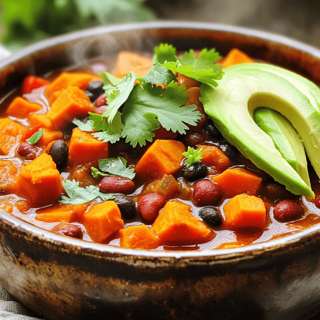 - 2 medium sweet potatoes, peeled and diced - 1 can (15 oz) black beans, rinsed and drained - 1 can (15 oz) kidney beans, rinsed and drained - 1 can (15 oz) diced tomatoes (with juices) - 1 onion, diced - 3 cloves garlic, minced - 1 red bell pepper, diced - 2 cups vegetable broth - 2 tablespoons chili powder - 1 teaspoon ground cumin - 1 teaspoon smoked paprika - 1/2 teaspoon cayenne pepper (optional, for heat) - Salt and pepper to taste When I make Vegan Sweet Potato Chili, I love using these fresh and hearty ingredients. Sweet potatoes give a nice depth to the dish. They add a sweet flavor and creamy texture. The black and kidney beans pack it with protein, making it filling. I always use ripe tomatoes, as they bring a juicy tang. Onions and garlic add a great base flavor. The red bell pepper gives a nice crunch and sweetness. Plus, the vegetable broth helps everything blend well. Now, let’s talk about spices. Chili powder gives it warmth, while cumin adds a smoky note. Smoked paprika enhances the flavor too. If you want a kick, cayenne pepper is your friend, but you can skip it if you prefer mild. This recipe is easy to adjust. You can add more spices or change the beans. You can find the full recipe at the end. Enjoy cooking! - Step 1: Heat 1 tablespoon of olive oil in a large pot over medium heat. Add 1 diced onion. Cook until the onion is translucent, about 4-5 minutes. - Step 2: Add 3 minced garlic cloves and 1 diced red bell pepper. Cook for another 2-3 minutes until fragrant. - Step 3: Now, add 2 medium sweet potatoes, peeled and diced. Sauté for about 5 minutes, stirring often. Add 2 tablespoons of chili powder, 1 teaspoon of ground cumin, 1 teaspoon of smoked paprika, and 1/2 teaspoon of cayenne pepper if you like heat. Stir well to coat the sweet potatoes with spices. Cook for 2 more minutes. - Step 4: Pour in 1 can of diced tomatoes (with juices) and 2 cups of vegetable broth. Bring the mixture to a boil. - Step 5: Reduce the heat to low. Cover the pot and let it simmer for about 20-25 minutes, or until the sweet potatoes are tender. - Step 6: Stir in 1 can of rinsed black beans and 1 can of rinsed kidney beans. Cook for an additional 5 minutes to heat through. Season with salt and pepper to taste. Serve hot, garnished with fresh cilantro and optional avocado slices. For the full recipe, check the [Full Recipe]. Enjoy your cooking! - Ensure sweet potatoes are evenly diced for uniform cooking. - Adjust spice levels to your taste by varying cayenne pepper. When cooking, I always make sure to cut the sweet potatoes into even pieces. This helps them cook at the same rate, so some don't turn mushy while others stay hard. If you like it spicy, add more cayenne pepper. If you prefer mild, use less or skip it altogether. - Best served with fresh cilantro. - Optional avocado slices for garnish. Presentation matters! I love to top my chili with fresh cilantro. It adds color and a nice flavor. Avocado slices also make a great garnish. They add creaminess and balance the heat. - Add more vegetables like corn or zucchini. - Experiment with different beans or grains. You can really make this chili your own. Try adding corn for sweetness or zucchini for texture. Different beans like chickpeas or lentils can change the taste too. You can even mix in grains like quinoa for added nutrition. Explore and have fun with it! For the complete recipe, check out the [Full Recipe]. {{image_2}} You can change up the beans in your chili. Chickpeas or lentils work great as substitutes. They add a nice texture and flavor. Using different beans can really change the taste. Try pinto or cannellini beans for a new twist. Mixing beans creates a fun, colorful dish. Each type brings its own unique flavor. Do you want a milder chili? Use less cayenne pepper. You can also skip it altogether. For more heat, add more cayenne or try jalapeños. You can mix in spices like crushed red pepper or chipotle powder for a smoky flavor. Taste as you go to find your perfect heat level. This helps you get the flavor just right. If you have non-vegan guests, suggest toppings like cheese or sour cream. These add a creamy texture and rich flavor. You can also serve the chili with cornbread or tortilla chips. These options make it fun for everyone. If you want to cater to omnivores, consider adding cooked ground meat. This can make your dish more filling for different eaters. After you make vegan sweet potato chili, let it cool. Store it in an airtight container. This chili lasts up to 5 days in the fridge. Make sure to label it with the date. This helps you keep track of how fresh it is. If you want to save some chili for later, freezing is a great option. Use freezer-safe containers or bags. Leave some space in the container, as the chili will expand while freezing. The chili stays good for up to 3 months in the freezer. When you're ready to eat, thaw it in the fridge overnight. Reheat it on the stove or in the microwave until hot. Stir it well to heat evenly. Batch cooking vegan sweet potato chili makes meal prep easy. You can double or triple the recipe for extra servings. Divide it into individual portions and store them in the fridge or freezer. On busy days, just grab a container and reheat it. It’s a quick meal that is both hearty and tasty! You can serve this chili with several great sides. Here are some ideas: - Cornbread for a sweet touch - Brown rice for a hearty base - Fresh salad for a crisp bite - Tortilla chips for a crunchy contrast - Avocado slices for creaminess Each side adds a unique flavor and texture to the meal. You can mix and match based on your mood or what you have on hand. Yes, you can use a slow cooker for this chili. Here’s how: 1. Sauté the onion, garlic, and bell pepper in a pan first. This builds flavor. 2. Add all ingredients to the slow cooker, including sautéed veggies. 3. Cook on low for 6-8 hours or high for 3-4 hours. 4. Stir in the beans during the last 30 minutes of cooking. This 