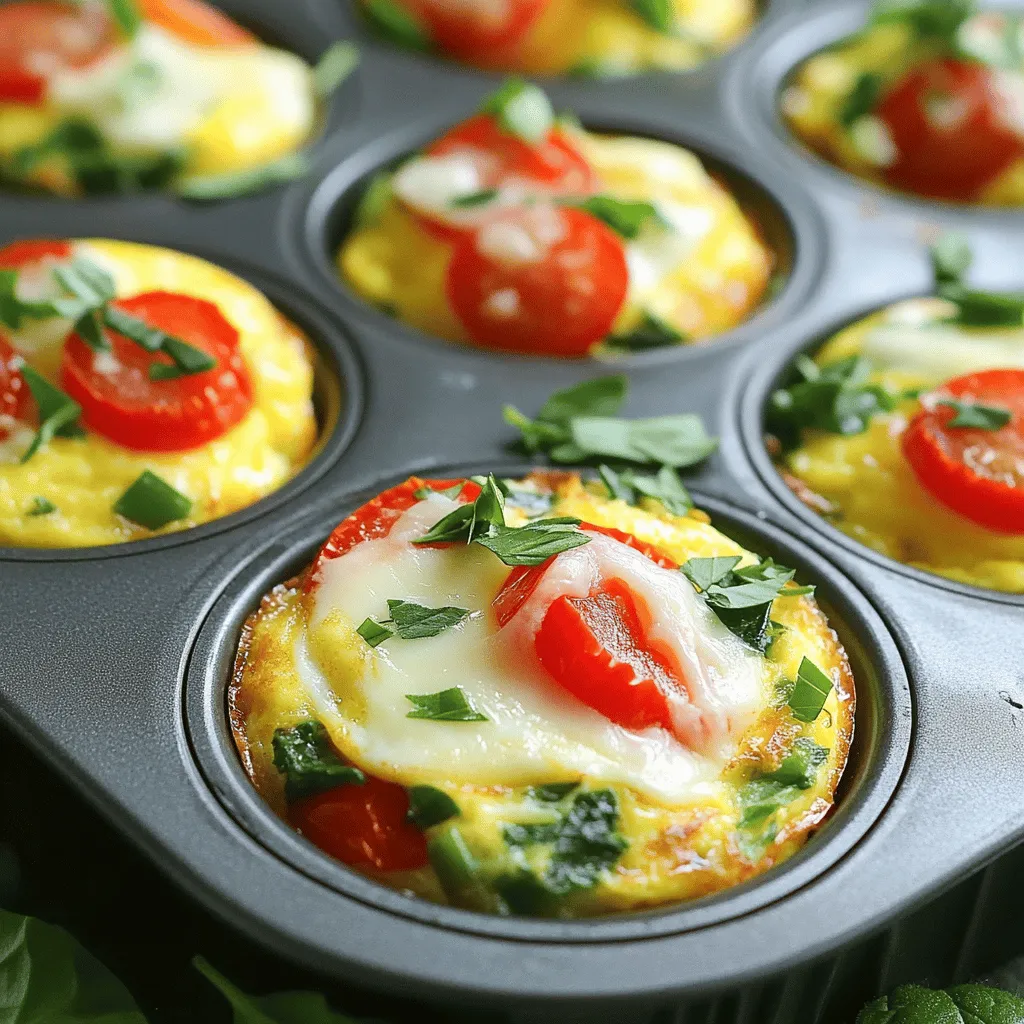- 6 large eggs - 1/2 cup milk (dairy or non-dairy) - 1/2 cup bell peppers, diced - 1/2 cup cherry tomatoes, halved - 1/4 cup red onion, finely chopped - 1 cup fresh spinach, chopped - 1/2 cup shredded cheese - 1 teaspoon garlic powder - 1 teaspoon salt - 1/2 teaspoon black pepper - Optional herbs for garnish The key to making delicious veggie-packed egg muffins is using fresh ingredients. I love to combine colorful bell peppers, juicy cherry tomatoes, and vibrant spinach. These veggies not only taste great but also make the muffins look appealing. The red onion adds a nice crunch and a bit of sweetness. I often use shredded cheese to give the muffins a creamy texture. You can pick your favorite cheese, like cheddar or mozzarella. It melts perfectly and binds everything together. The garlic powder adds a nice kick of flavor, while salt and black pepper highlight the taste of the veggies. Feel free to change up the herbs for garnish. Fresh parsley or basil can add a burst of color and flavor. Using seasonal vegetables can also make these muffins even better. This way, you can enjoy fresh and tasty bites any time of the year! Start by preheating your oven to 375°F (190°C). This step is key for even cooking. Next, grease your muffin tin with cooking spray. You can also line it with paper liners if you prefer. This will help the muffins slide out easily once they cool. In a large bowl, whisk together 6 large eggs and 1/2 cup of milk. Make sure they blend well. Then, add 1/2 cup of diced bell peppers, 1/2 cup of halved cherry tomatoes, 1/4 cup of finely chopped red onion, and 1 cup of chopped fresh spinach. These veggies add great flavor and nutrition. Stir in 1/2 cup of shredded cheese, 1 teaspoon of garlic powder, 1 teaspoon of salt, and 1/2 teaspoon of black pepper. Mix everything until it's evenly combined. Pour the egg mixture into your prepared muffin tin. Fill each cup about 3/4 full. This gives the muffins room to rise. Bake them in the preheated oven for 18-20 minutes. Check doneness by inserting a toothpick in the center. It should come out clean. Once done, remove the muffins from the oven and let them cool in the tin for a few minutes. After that, gently take them out. If you like, add fresh herbs on top for a nice touch before serving. You can change up the veggies in your muffins. Some great options are: - Zucchini, shredded - Broccoli, finely chopped - Kale, chopped Feel free to mix and match! You can also swap out the cheese. Here are some tasty choices: - Feta for a tangy twist - Mozzarella for a mild flavor - Pepper jack for some spice To make your muffins fluffy, be sure to whisk the eggs and milk well. You want a nice, smooth mix. Adding a bit of baking powder can help too. When filling the muffin cups, don’t go all the way to the top. Fill each cup about 3/4 full. This gives the muffins room to rise without spilling over. Garnish your muffins with fresh herbs like parsley or basil. They add color and freshness. For sides, consider serving your egg muffins with: - Fresh fruit for sweetness - A light salad for crunch - Whole-grain toast for heartiness These side options make for a well-rounded meal. Enjoy your tasty creations! {{image_2}} You can add protein to your veggie packed egg muffins in many ways. If you love meat, try adding crispy bacon or diced ham. These options enhance the flavor and add a savory touch. Just cook the meat first, then mix it into the egg base. For those who prefer vegetarian options, you can use beans or tofu. Both options give you the protein boost you need while keeping it meat-free. Consider adding black beans or crumbled tofu for a hearty bite. To shake things up, change the flavor profile of your muffins. For a Southwest twist, add spices like cumin and chili powder. Mix in diced jalapeños for a spicy kick. Top with avocado after baking for a creamy finish. If Mediterranean flavors appeal to you, try adding feta cheese and olives. You can also include sun-dried tomatoes and fresh herbs like oregano or basil. These changes will transport your taste buds to sunny shores. Using seasonal vegetables makes these muffins fresher and tastier. In spring, add asparagus or peas. In summer, use zucchini or corn. In fall, try pumpkin or sweet potatoes for a comforting touch. In winter, root veggies like carrots or parsnips work wonders. You can also adapt the recipe for holidays. For a festive touch, include colorful bell peppers and herbs for a bright presentation. This way, your muffins become a fun part of your holiday meals. To keep your veggie packed egg muffins fresh, store them in the fridge. Place them in an airtight container. This helps maintain their taste and texture. If you want to freeze them, wrap each muffin tightly in plastic wrap. Then place them in a freezer bag. This will keep them safe from freezer burn. You can reheat your muffins in two ways: the microwave or the oven. For the microwave, heat on high for 30 seconds. Check if it’s warm enough; if not, heat for another 15 seconds. In the oven, preheat it to 350°F (175°C). Place the muffins on a baking sheet and heat for 10-12 minutes. This method helps keep their texture just right. Veggie packed egg muffins last in the fridge for about 5 days. If you freeze them, they can last up to 3 months. Check for signs of spoilage, like a sour smell or changes in texture. If you see any mold, throw them away right away. Yes, you can use egg substitutes. Some great options include: - Silken tofu (1/4 cup per egg) - Unsweetened applesauce (1/4 cup per egg) - Flaxseed meal mixed with water (1 tablespoon flaxseed with 2.5 tablespoons water per egg) These substitutes work well to bind the ingredients. They may change the taste slightly but still offer great texture. You can tell when the muffins are done by looking for these signs: - The tops should be lightly golden. - The edges will pull away from the muffin tin. - A toothpick inserted in the center should come out clean. If you see any 