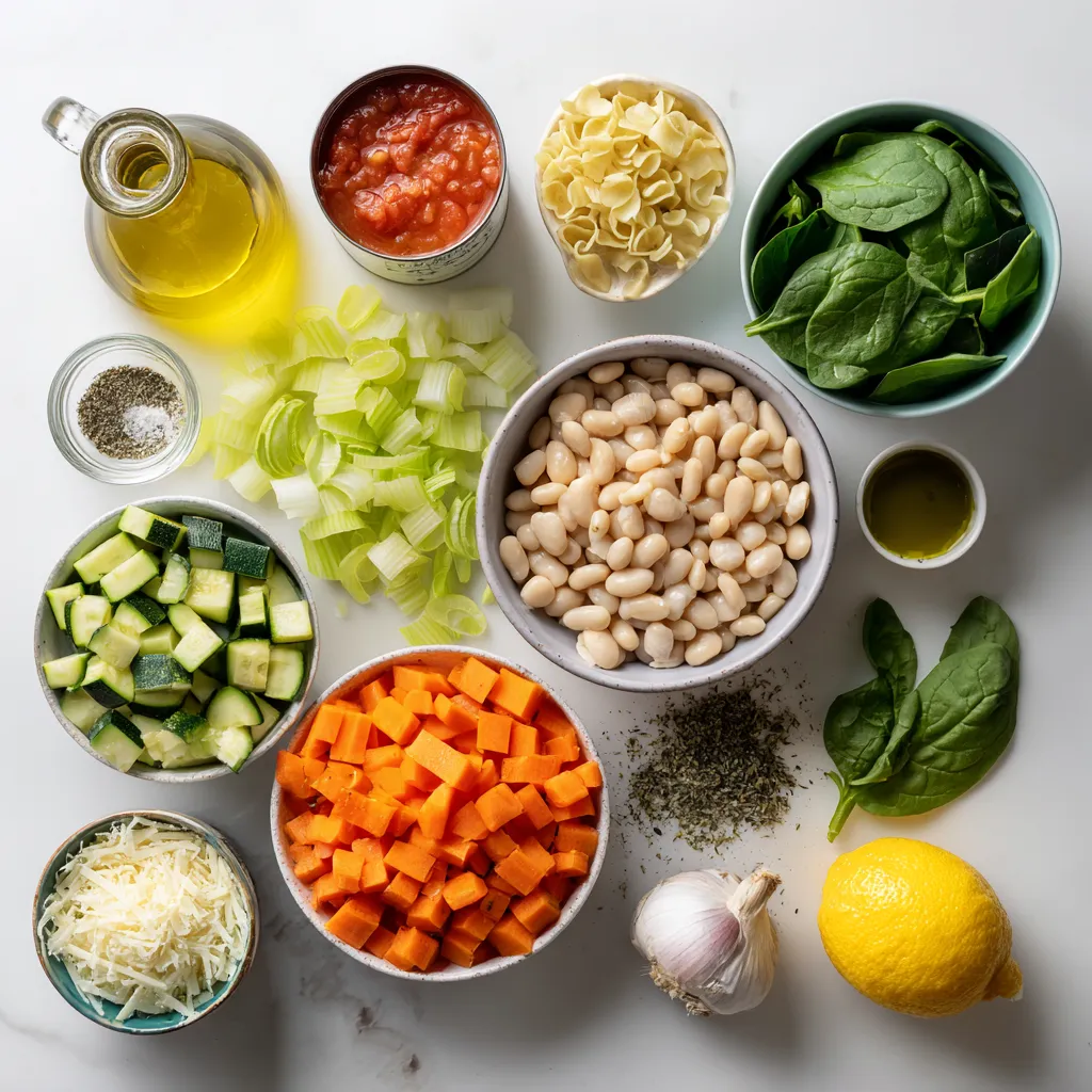 To make veggie packed minestrone soup, gather these simple ingredients: