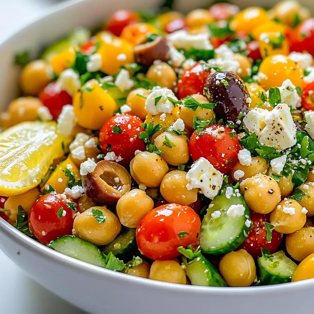 A refreshing and vibrant salad featuring chickpeas, fresh vegetables, and a tangy dressing.