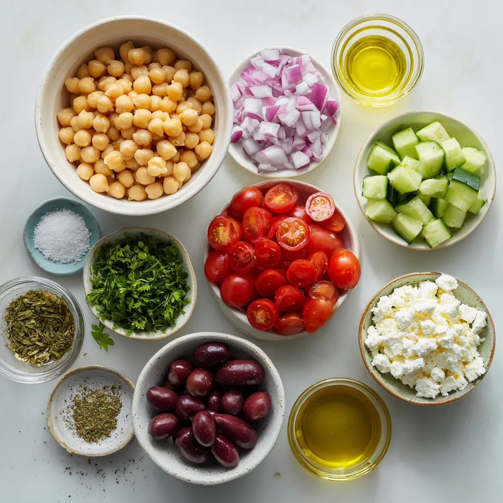 This salad starts with chickpeas. They are packed with protein and fiber. They add a nice texture. Next, we have fresh cherry tomatoes. Their sweetness brightens the dish. Diced cucumber gives a crunchy bite. Finely chopped red onion adds a sharp taste.