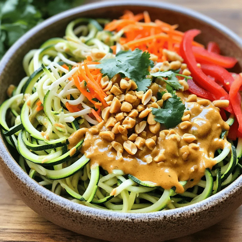 ![- Zucchini noodles: Use 4 medium zucchinis. Spiralize them into thin noodles. This makes them light and fun. - Other fresh vegetables: Add 1 cup of bean sprouts, 1 cup of shredded carrots, 1 red bell pepper sliced thin, and 3 chopped green onions. These add crunch and color. - Flavor enhancers: Use 2 cloves of minced garlic, 1 tablespoon of grated ginger, and 1 teaspoon of chili paste. These give your dish a zesty kick. - Peanut butter: Use 3 tablespoons of peanut butter or almond butter for creaminess. Both options are tasty and rich. - Soy sauce: Use 2 tablespoons of soy sauce or tamari for a gluten-free choice. This adds saltiness and depth. - Lime juice and sesame oil: Add 2 tablespoons of lime juice and 1 tablespoon of sesame oil for a fresh zing and aroma. - Roasted peanuts: Chop 1/4 cup of roasted peanuts. Add them on top for a crunchy finish. You can toast them lightly for more flavor. - Fresh cilantro: Use fresh cilantro as a garnish. It brightens the dish and adds freshness. Add it just before serving for the best taste. For the full recipe, check out the detailed instructions to make this dish a delight. To start, spiralize four medium zucchinis into noodles. You can use a spiralizer or a vegetable peeler. This step gives you the fun, noodle-like texture. Next, prep your vegetables. Thinly slice one red bell pepper and shred one cup of carrots. Chop three green onions and mince two cloves of garlic. Also, grate one tablespoon of fresh ginger. Now, let’s make the sauce. In a small bowl, mix together three tablespoons of peanut butter, two tablespoons of soy sauce, two tablespoons of lime juice, and one tablespoon of chili paste. Stir until smooth. This sauce adds a rich, tangy flavor to your dish. Heat one tablespoon of sesame oil in a large skillet or wok over medium-high heat. Once hot, add the minced garlic and grated ginger. Stir for about 30 seconds until fragrant. Next, add the sliced red bell pepper and shredded carrots. Sauté them for 2-3 minutes until they soften. Now, it’s time to add the zucchini noodles. Toss them in and cook for 2-3 more minutes. Gently mix to heat the noodles without making them soggy. Once the noodles are ready, pour the sauce over the vegetables. Add the bean sprouts and chopped green onions. Toss everything until it’s evenly coated and warm. Serve right away. Garnish with chopped roasted peanuts and fresh cilantro for a perfect finish. The Full Recipe is easy to follow and will have you enjoying a delightful, healthy meal in no time! To avoid soggy zucchini noodles, make sure you sauté them quickly. Cook them for only 2-3 minutes. This keeps them firm and tasty. If you cook them too long, they get mushy. Timing also matters for other vegetables. Add carrots and bell peppers first. Sauté these for 2-3 minutes. Then, add the zucchini noodles to the pan. This keeps everything crisp and fresh. If you need a peanut butter alternative, try almond butter or sunflower seed butter. These work well and still taste great. You can also use tahini for a nut-free option. Adjusting spice levels is easy. Use more or less chili paste based on your taste. Start with one teaspoon. Then, taste your dish and add more if you like it spicier. Pair Zucchini Noodle Pad Thai with proteins like tofu, chicken, or shrimp. Each option adds flavor and makes the meal more filling. If you want to go meatless, tofu is a great choice. For sides, try serving this dish with a light salad or spring rolls. You can also enjoy it with a refreshing drink. Coconut water or iced tea complements the flavors well. For the full recipe, check out the [Full Recipe]. {{image_2}} You can easily change up your Zucchini Noodle Pad Thai. Instead of zucchini noodles, try shirataki noodles. These noodles are low in calories and carbs. They soak up flavors well, making your dish even tastier. If you want a vegan version, swap the peanut butter for almond butter. You can also use tamari instead of soy sauce to keep it gluten-free. This keeps the dish healthy and delicious for everyone. Don’t be afraid to play with flavors. You can try different sauces like hoisin or sriracha for a spicy kick. Adding a splash of coconut aminos can also give a sweet touch. Herbs make a big difference too. Fresh basil or mint can add a nice twist. You might also want to top your dish with sesame seeds or sliced scallions for extra crunch and flavor. Meal prepping this dish is a smart choice. You can spiralize all your zucchini in advance and store it in the fridge. Just keep it in a sealed bag to keep it fresh. For easy weeknight dinners, cook the sauce ahead of time. When you’re ready to eat, just heat it up and toss it with your veggies. If you make a big batch, you can freeze it for later. To reheat, use a skillet over low heat. This way, your noodles stay tender and don’t turn mushy. Enjoy this fresh take on a classic dish! For the full recipe, check out the details above! To keep Zucchini Noodle Pad Thai fresh, store it in the fridge. Use an airtight container to seal in the flavors. This helps keep the dish from drying out. Make sure to cool the dish to room temperature before sealing it up. This will prevent condensation inside the container. Zucchini Noodle Pad Thai stays fresh for about three days in the fridge. After that, it may lose its flavor and texture. Look for signs of spoilage, like a sour smell or slimy noodles. If you notice any of these signs, it's best to toss it out. When reheating, use a skillet over low heat. This method warms the dish evenly and keeps the noodles firm. You can add a splash of water or a bit of oil to help with moisture. Avoid using a microwave if you can. It often makes the noodles soggy. Stir gently to ensure even heating and enjoy your delicious meal again! For the full recipe, check out the previous section. To make Zucchini Noodle Pad Thai vegan, swap out non-vegan ingredients. Use almond butter instead of peanut butter. Replace any egg with silken tofu for 