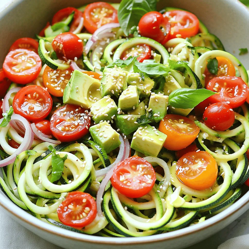 - 3 medium zucchinis, spiralized - 1 cup cherry tomatoes, halved - 1 bell pepper (any color), diced - 1/2 red onion, thinly sliced - 1 avocado, diced - 2 tablespoons extra virgin olive oil - 1 tablespoon lemon juice - 1 teaspoon honey or agave syrup - Salt and pepper to taste - Fresh basil, chopped - Sesame seeds To make my zucchini noodle salad pop, I use fresh, vibrant ingredients. The zucchinis serve as the base. Spiralizing them gives a fun twist. Cherry tomatoes add sweetness, while bell peppers bring crunch. The red onion gives a nice bite, and avocado adds creaminess. For the dressing, I keep it simple yet flavorful. Extra virgin olive oil adds richness. Lemon juice gives a bright zing. Honey or agave syrup balances the flavors. I finish with salt and pepper to enhance everything. For extra flair, I love to sprinkle fresh basil on top. It adds a lovely aroma. Sesame seeds give a nice crunch and look great too. This salad is fresh, colorful, and great for any meal. You can find the full recipe in the provided details. Enjoy creating this dish! To start, spiralize the zucchinis to make noodle-like strands. You can use a spiralizer or a vegetable peeler. If you use a peeler, make thin ribbons. This gives a fun shape to your salad. Next, sprinkle salt over the zucchini noodles. Let them sit for about ten minutes. This step helps soften the noodles. While the zucchini rests, prepare the other vegetables. Halve the cherry tomatoes and dice the bell pepper. Slice the red onion thinly. Each of these adds color and taste. In a small bowl, whisk the dressing. Mix together olive oil, lemon juice, honey, salt, and pepper. Whisk until everything blends well. Once the zucchini noodles are ready, pat them dry with a paper towel. This removes any extra moisture. Now, add the cherry tomatoes, bell pepper, red onion, avocado, and fresh basil to the bowl with the noodles. Drizzle the dressing over the top. Toss the salad gently until all the ingredients are coated. Taste it and adjust the seasoning with more salt, pepper, or lemon juice. Let the salad sit for about five minutes to meld the flavors. For the full recipe, check the earlier section. Enjoy your fresh and flavorful zucchini noodle salad! To make zucchini noodles, you need the right tools. I recommend using a spiralizer. This tool creates long, thin noodles quickly. If you don't have one, use a vegetable peeler. You can slice the zucchini into thin ribbons. Both methods work well! Adjust the seasoning to match your taste. Start with salt and pepper. If you want more flavor, try adding garlic powder or chili flakes. Fresh herbs like dill or oregano can boost the taste too. Don't be afraid to experiment! Serve your salad in a large bowl. This makes it easy to mix and enjoy. For a pretty touch, garnish with extra basil leaves. A sprinkle of sesame seeds adds crunch and color. These small details make a big difference! Try the Full Recipe to see how all these tips come together in a tasty dish! {{image_2}} You can mix up the dressing for your Zucchini Noodle Salad in fun ways. For a bright vinaigrette, use balsamic vinegar or apple cider vinegar instead of lemon juice. If you like creamy dressings, try Greek yogurt or tahini mixed with herbs. These options add new flavors and keep the salad exciting! Boost the protein in your salad with tasty options. Add grilled chicken, shrimp, or tofu for extra energy. You can also toss in extra veggies, like diced cucumbers or shredded carrots, for a colorful crunch. These add-ins make the salad more filling and fun. Change your salad with the seasons! In spring, add fresh peas and thinly sliced radishes for a crisp taste. In summer, throw in juicy berries or ripe peaches for a sweet touch. These seasonal fruits and veggies brighten the salad and enhance its flavor. Explore these variations to make your Zucchini Noodle Salad your own! For the full recipe, check the earlier section. To keep your Zucchini Noodle Salad fresh, use a tight-sealing container. Glass or BPA-free plastic works best. Make sure the container is clean and dry before adding the salad. Store it in the fridge right away. This helps keep the flavors bright and the veggies crisp. The salad stays fresh for about 2 to 3 days in the fridge. After that, the zucchini may become soggy. Look for signs of spoilage, such as a sour smell or slimy texture. If you notice these signs, it’s best to discard the salad. You should not heat zucchini noodles. They lose their texture and become mushy when heated. Instead, enjoy leftover Zucchini Noodle Salad cold. You can add fresh herbs or a splash of lemon juice to revive the flavors. This keeps your meal vibrant and tasty. Yes, zucchini noodle salad is low in carbs. Zucchini has about 2 grams of net carbs per cup. This makes it a great choice for anyone watching their carb intake. The other veggies like bell peppers and tomatoes add flavor without many carbs. This salad is also rich in fiber, vitamins, and minerals, which support good health. You can make this salad ahead of time. To keep it fresh, prepare the salad without the dressing. Store the zucchini noodles and veggies in a bowl and cover it with plastic wrap. You can make the dressing in a jar and keep it in the fridge. Just mix the salad with the dressing right before serving to keep it crisp. If you don't have zucchini, you can try other veggies. Cucumbers are a great choice. They add a nice crunch. Carrots can work too if you spiralize them. Use a vegetable peeler for thin ribbons. You can also try yellow squash for a different flavor and color. Yes, this salad is great for meal prep. Store the salad in airtight containers. Keep the dressing separate until you are ready to eat. This way, the noodles and veggies stay fresh. You can enjoy this salad for lunch or dinner throughout the week. Check out the Full Recipe for more details on making it! Zucchini noodle salad is fresh, simple, and packed with flavor. You learned about key ingredients, li